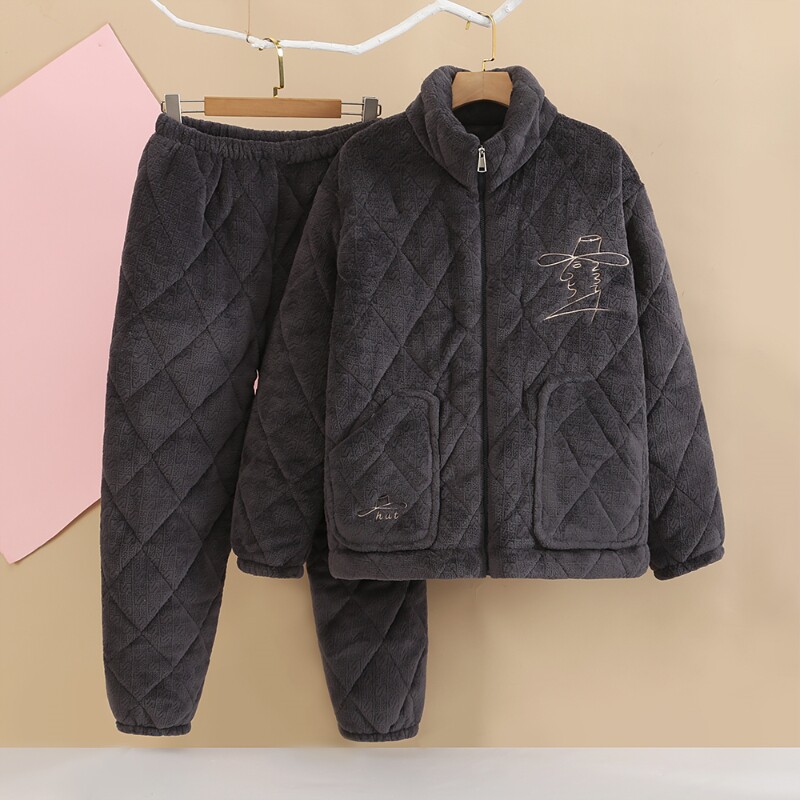 冬男珊瑚绒夹棉可外穿睡衣三层加厚牛奶绒保暖棉衣休闲家居服套装