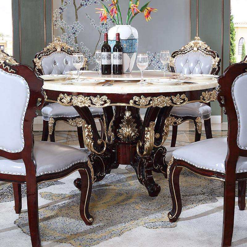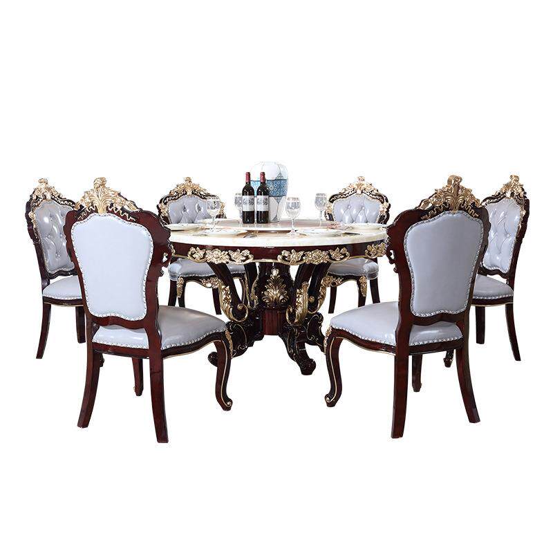 轻奢家用大理石实木餐桌椅子组合 酒店餐厅欧式雕花圆饭桌带转盘