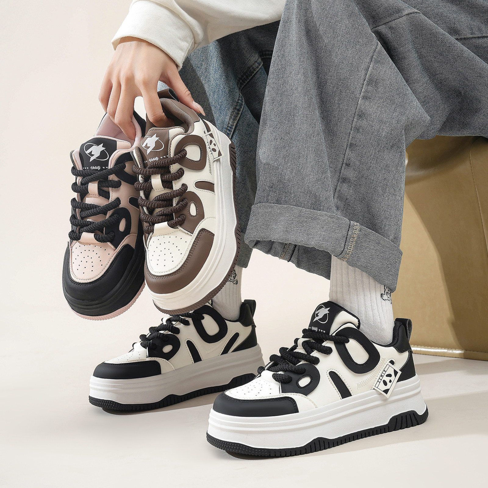 米白色原创小众厚底面包鞋女百搭运动休闲板鞋学生小白鞋2025新款