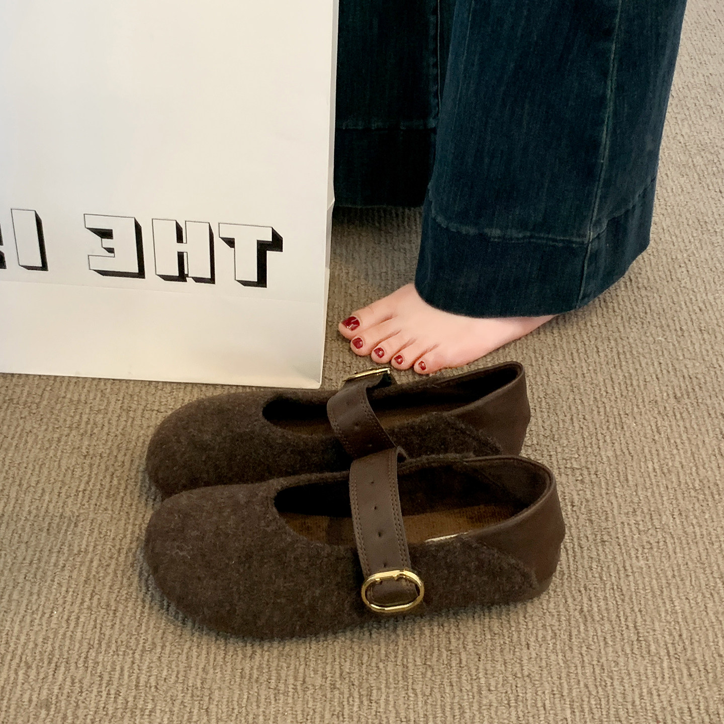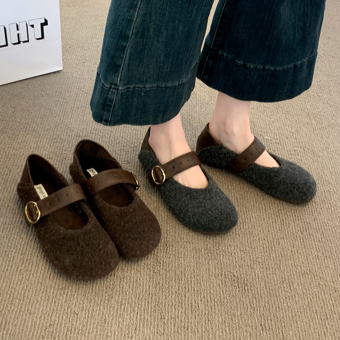 羊皮版复古玛丽珍鞋女方头秋冬季加绒保暖毛毛棉鞋平底晚晚单鞋女