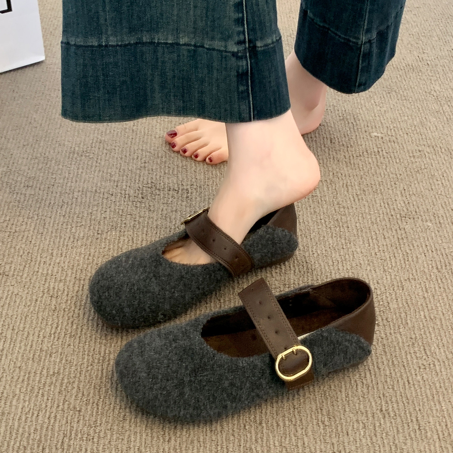 灰色加绒呢子勃肯鞋女2025秋冬新款毛毡平底豆豆鞋毛毛玛丽珍棉鞋