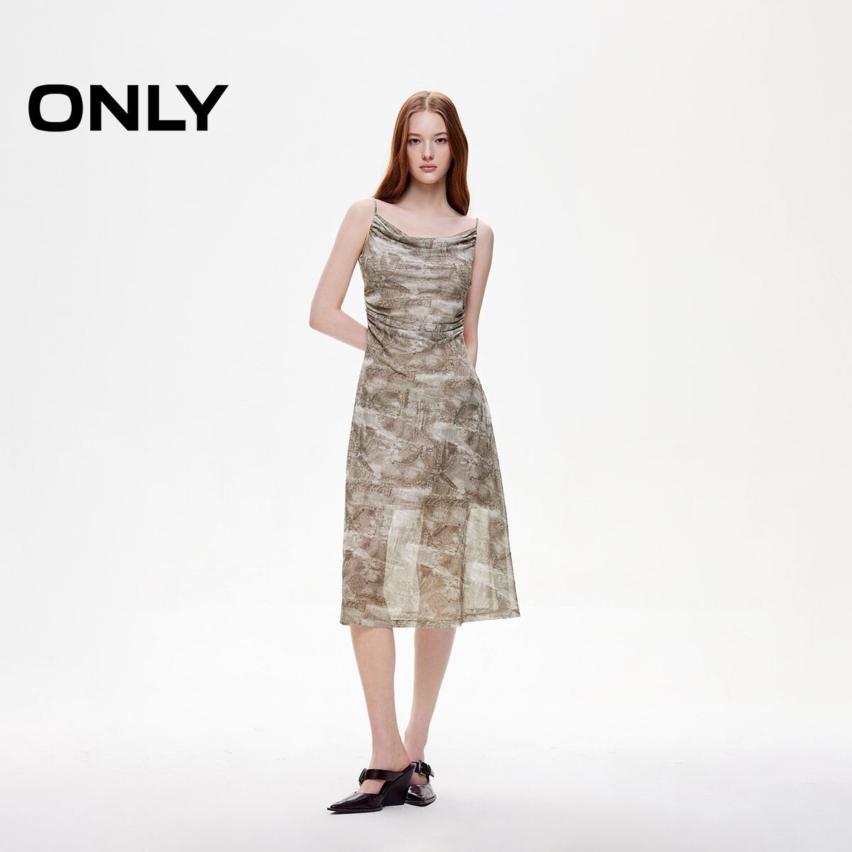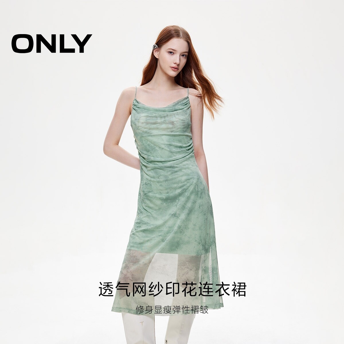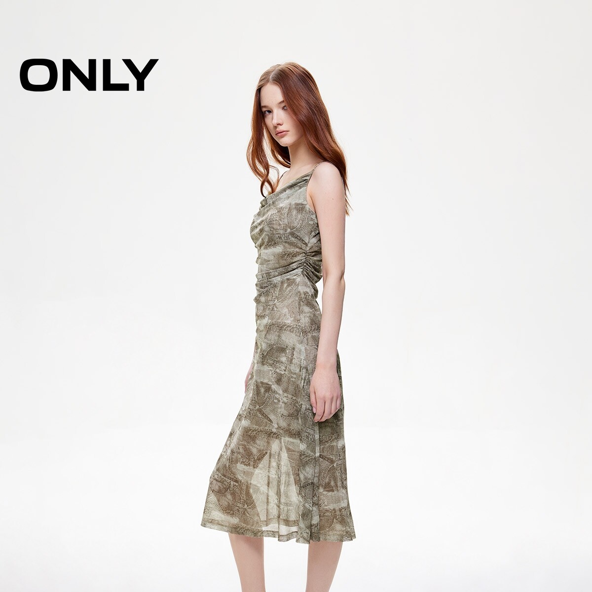 【ONLY奥莱】春季性感荡领网纱印花褶皱设计修身中长裙连衣裙女