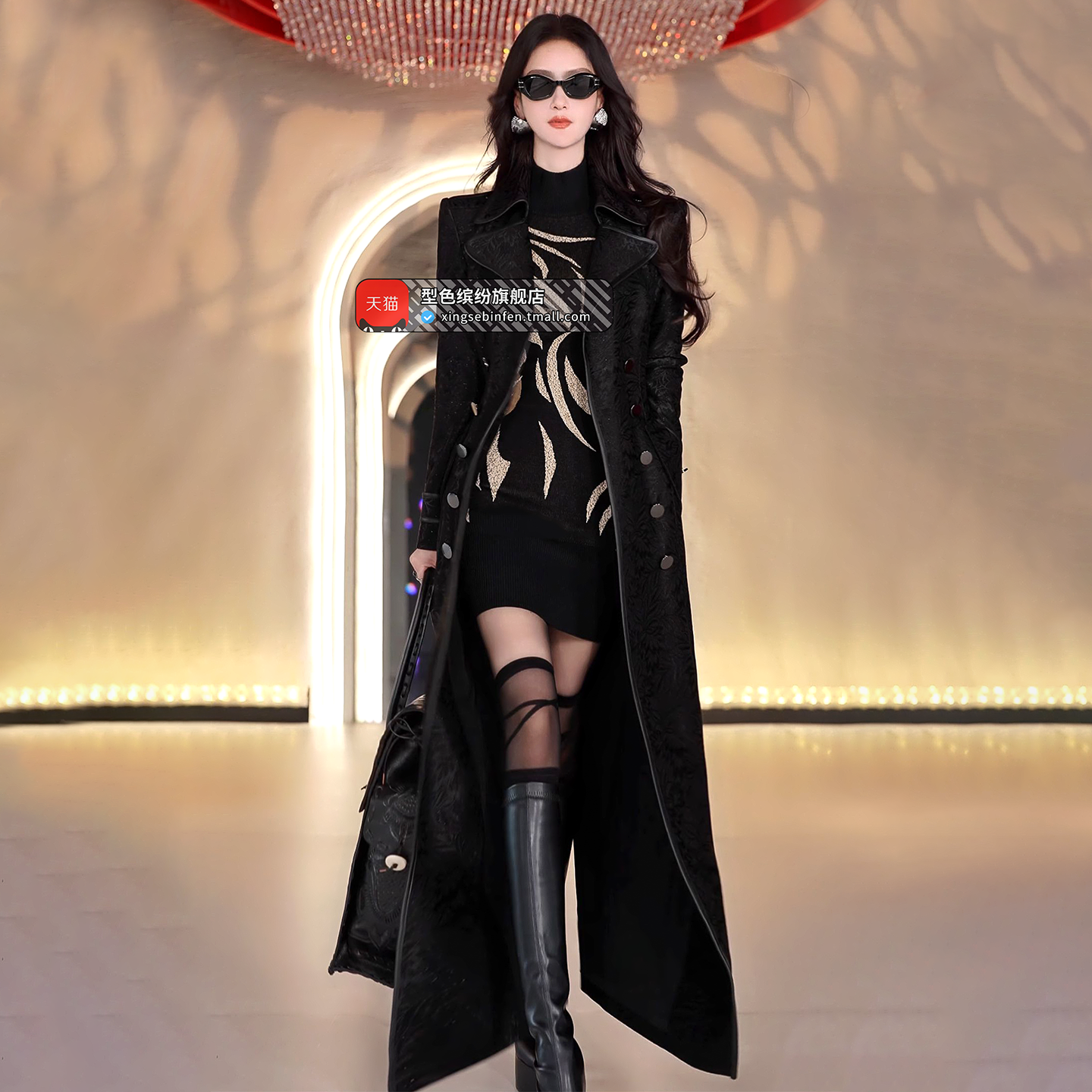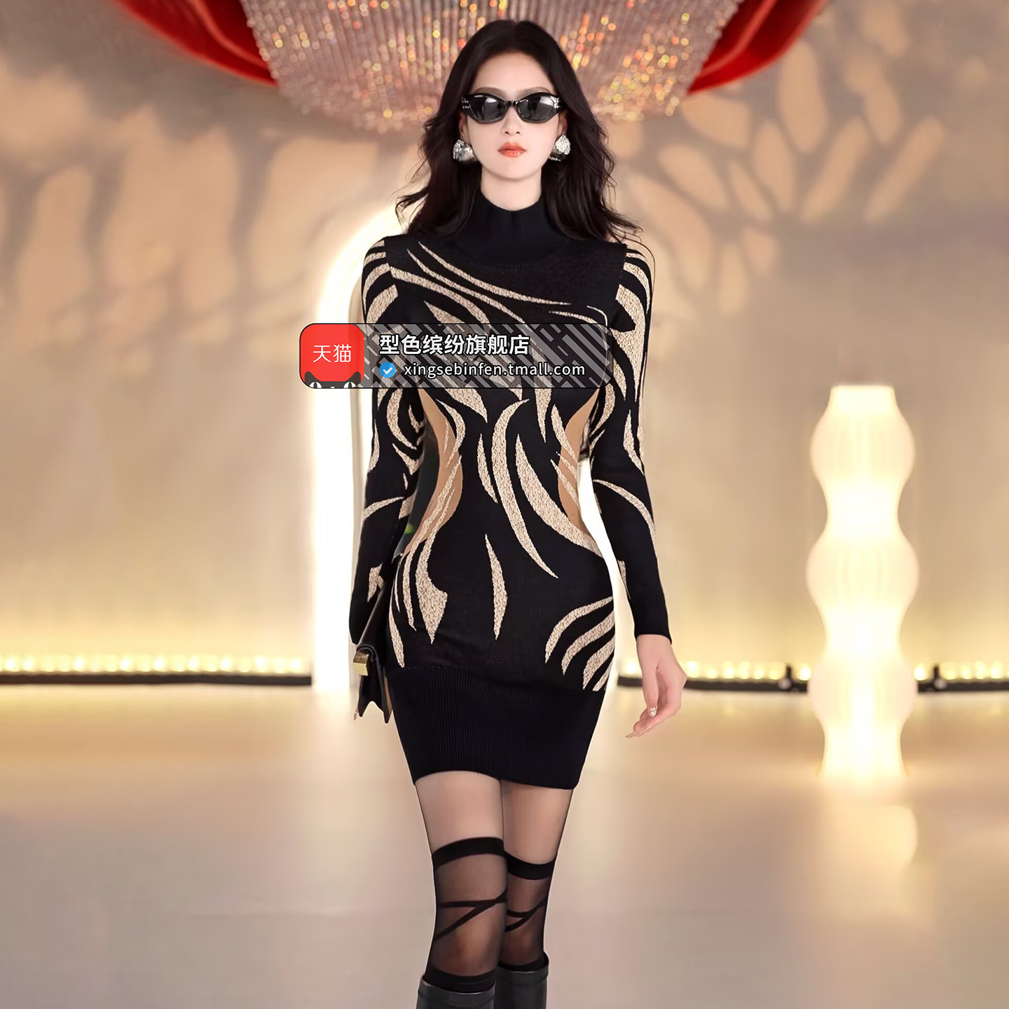 秋冬季时尚欧美风撞色提花高领连衣裙2025新款修身收腰包臀针织裙