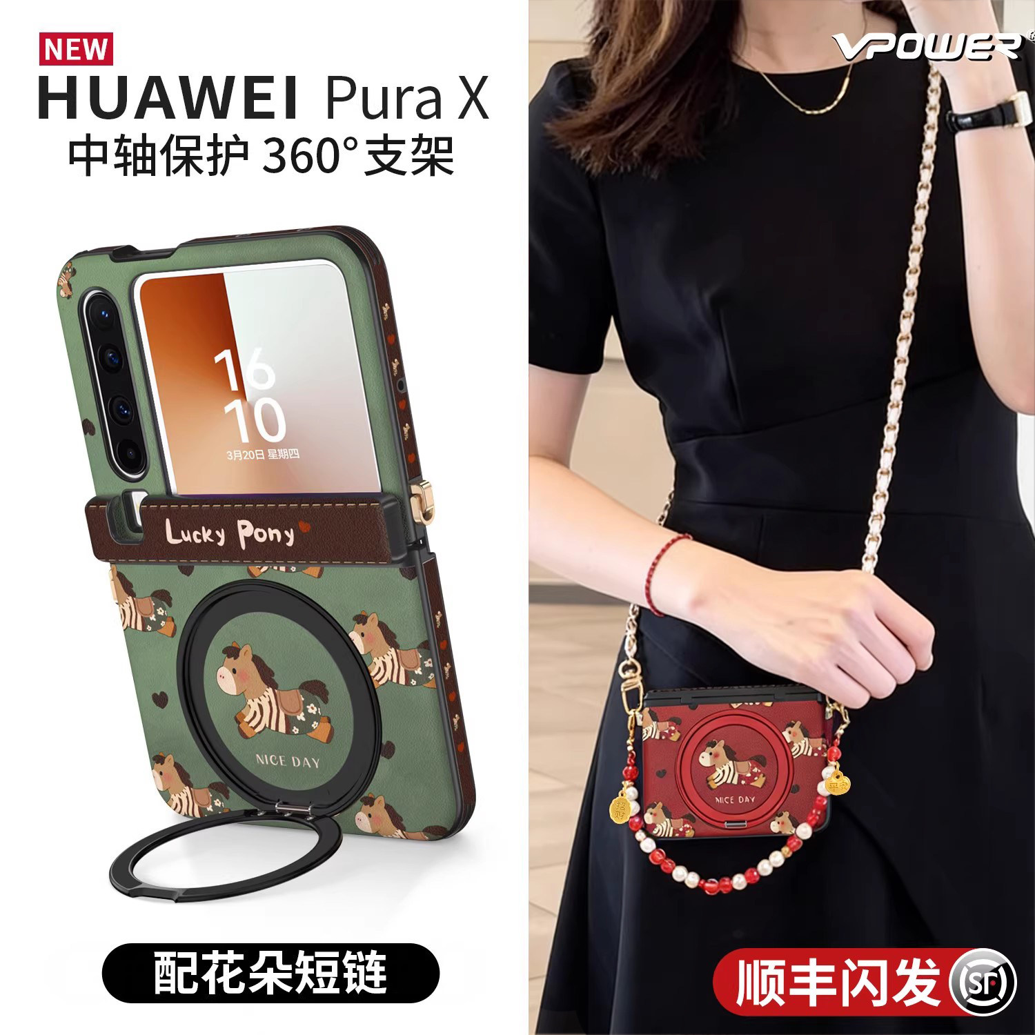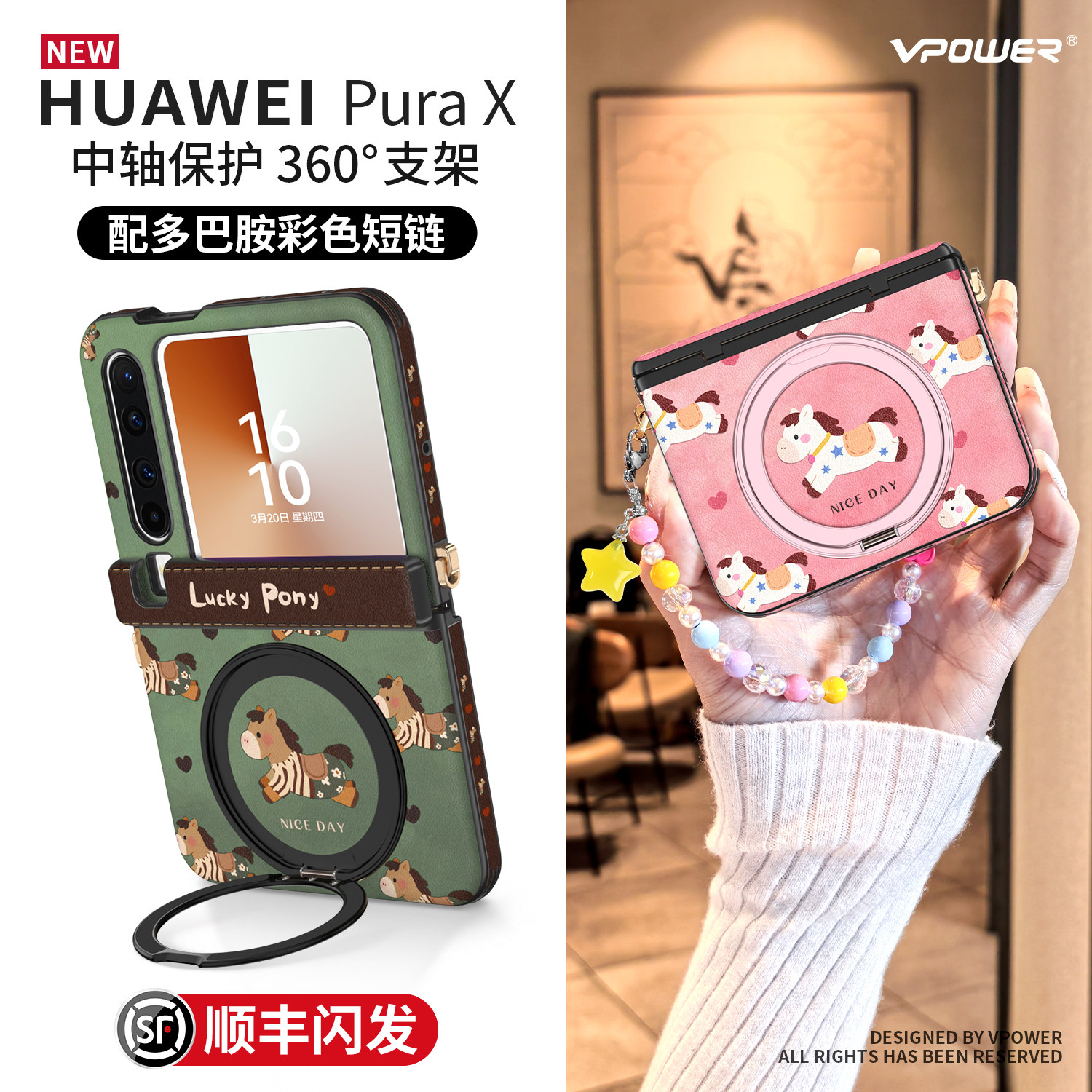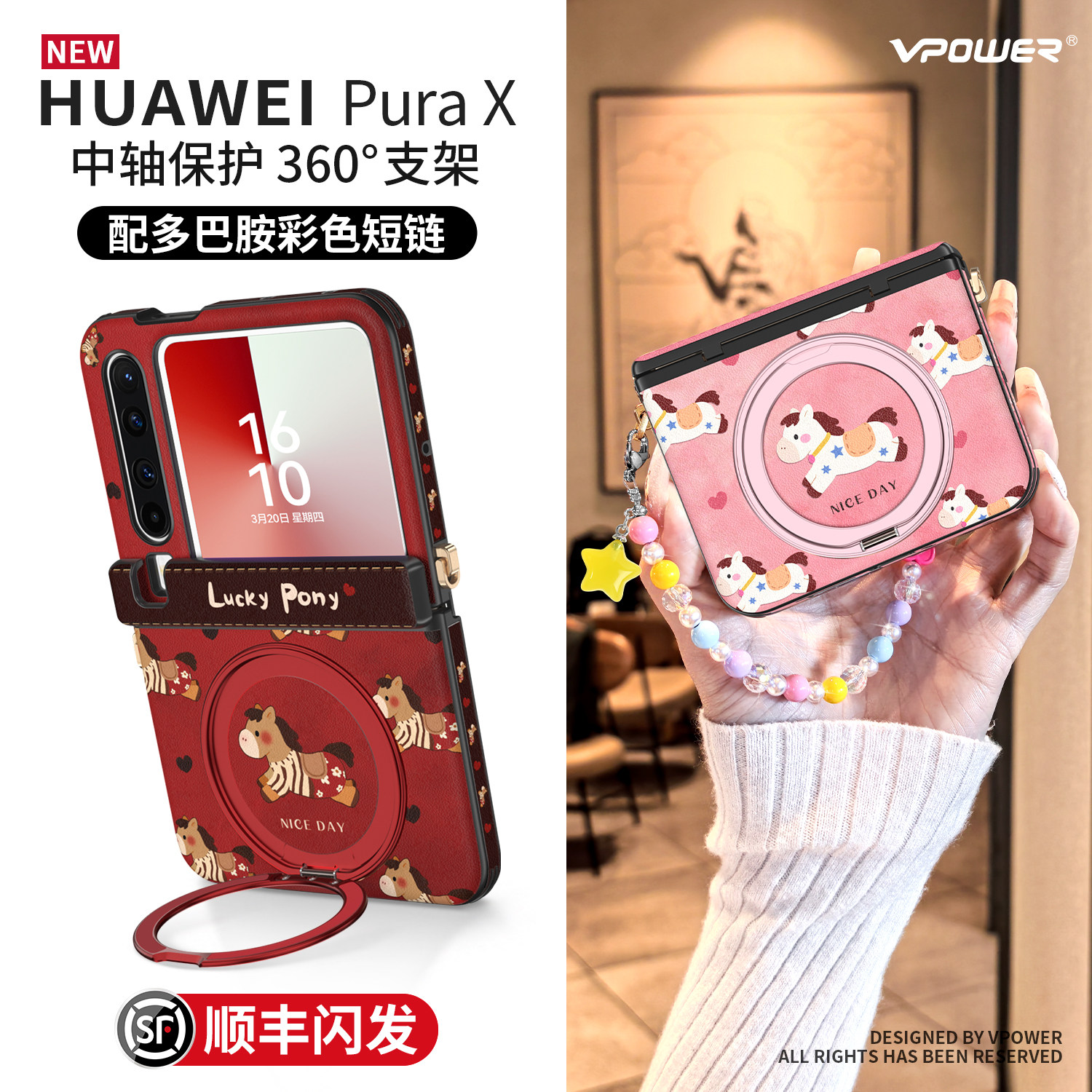 复古小马适用华为purax手机壳新款360旋转支架pura典藏版x带挂绳折叠屏高档皮纹磁吸中轴全包保护防摔斜挎女