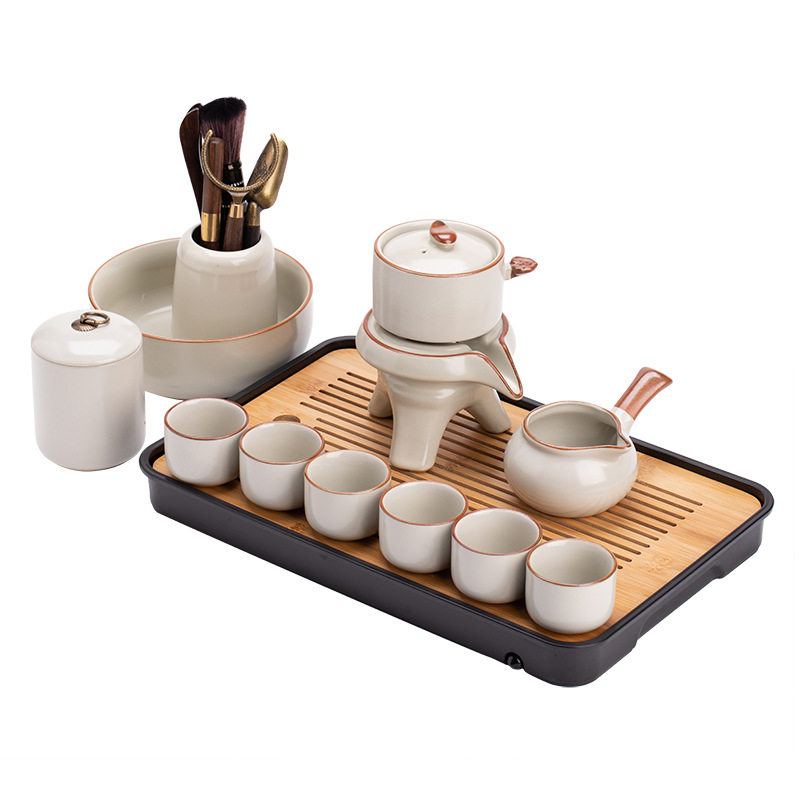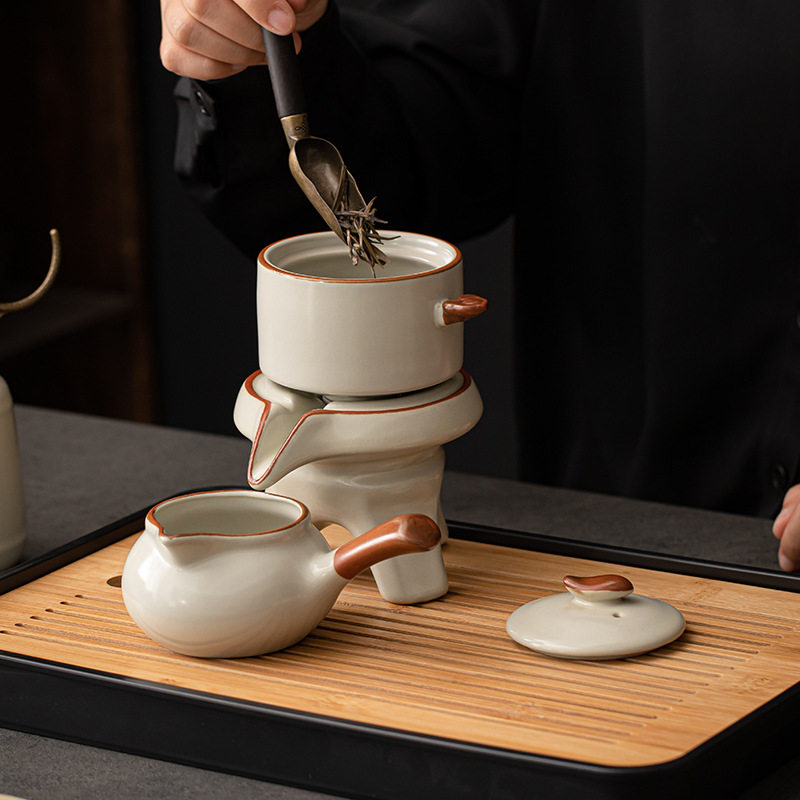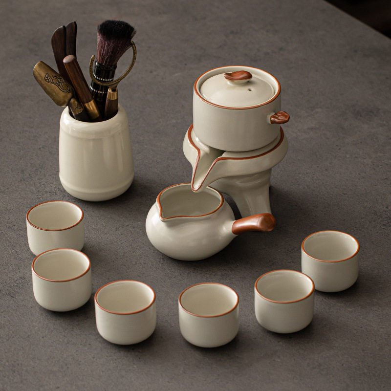 汝窑功夫茶具套装自动泡茶器懒人石磨旋转出水家用中式泡茶壶茶杯