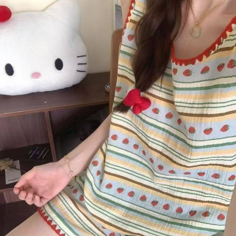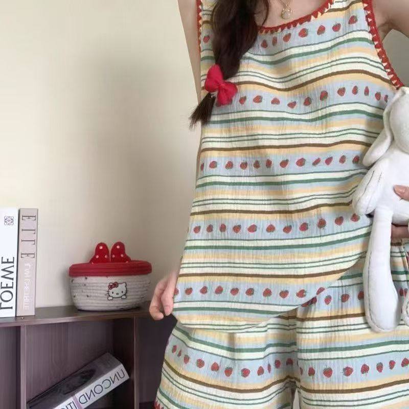 草莓女款夏季吊带睡衣套装2025新款家居休闲款甜美可外穿条纹短裤