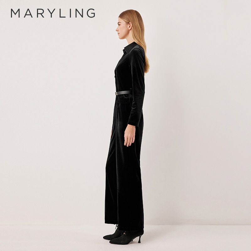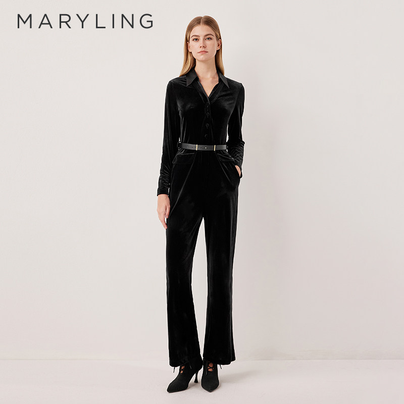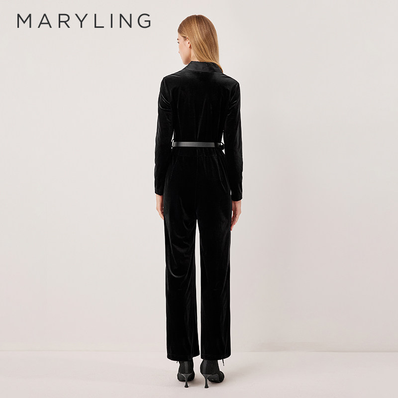 MARYLING玛俪琳2025秋季新品黑色翻领丝绒长袖连体裤A1FFW57040