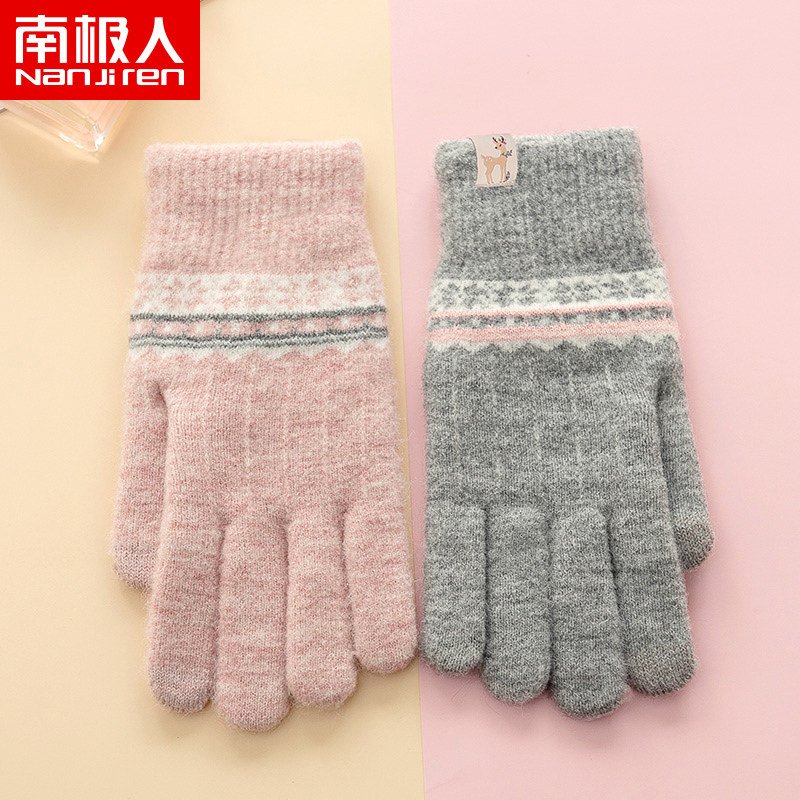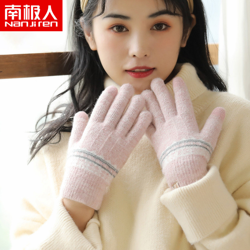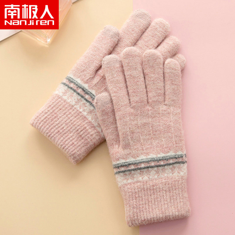 南极人毛线手套女秋冬针织加绒厚户外保暖骑行开车触屏可爱韩版A