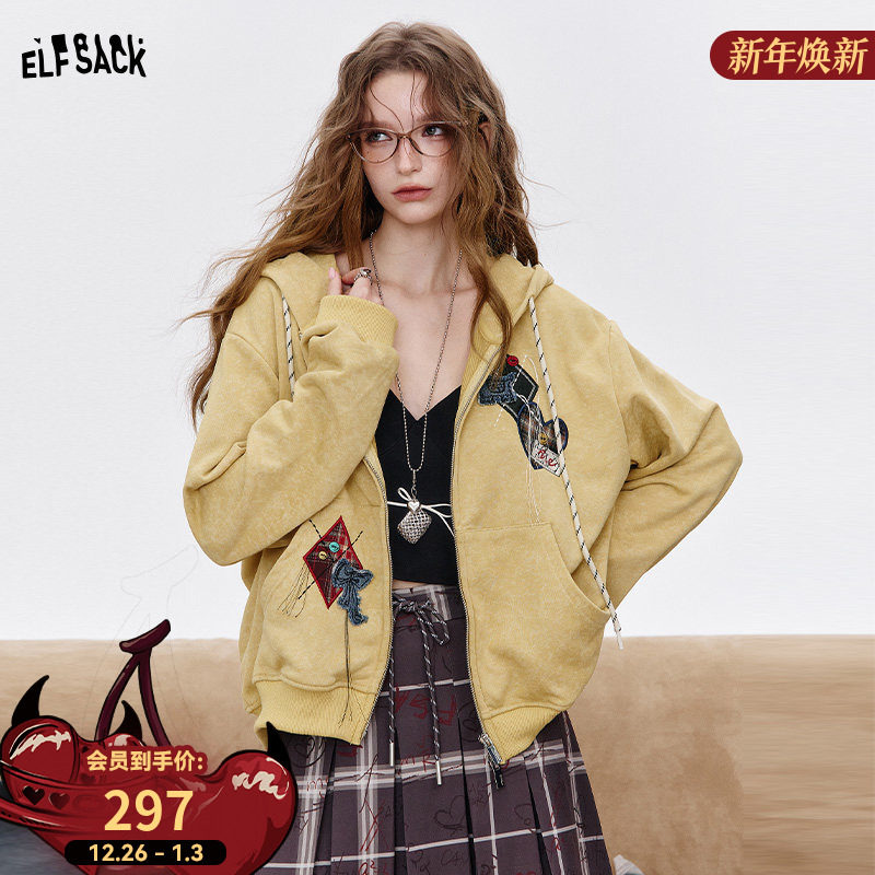 妖精的口袋复古刺绣连帽卫衣外套女2025年秋季新款宽松短款上衣
