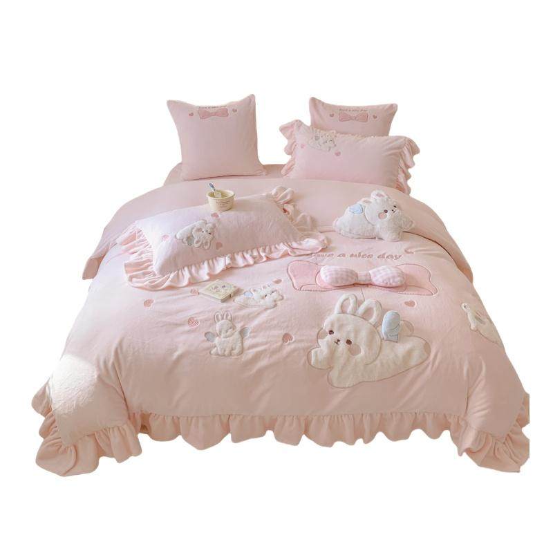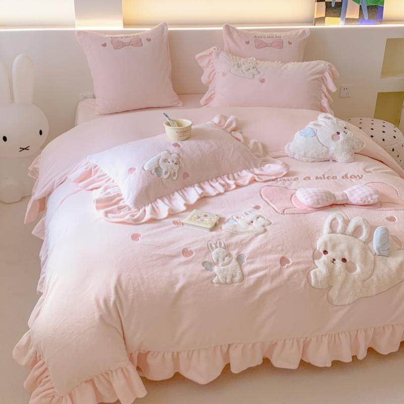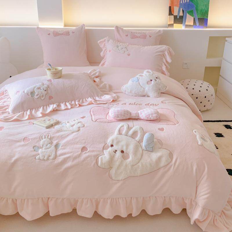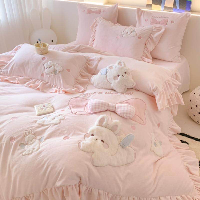少女心兔子牛奶绒四件套冬季可爱花边保暖珊瑚绒床上用品加厚被套