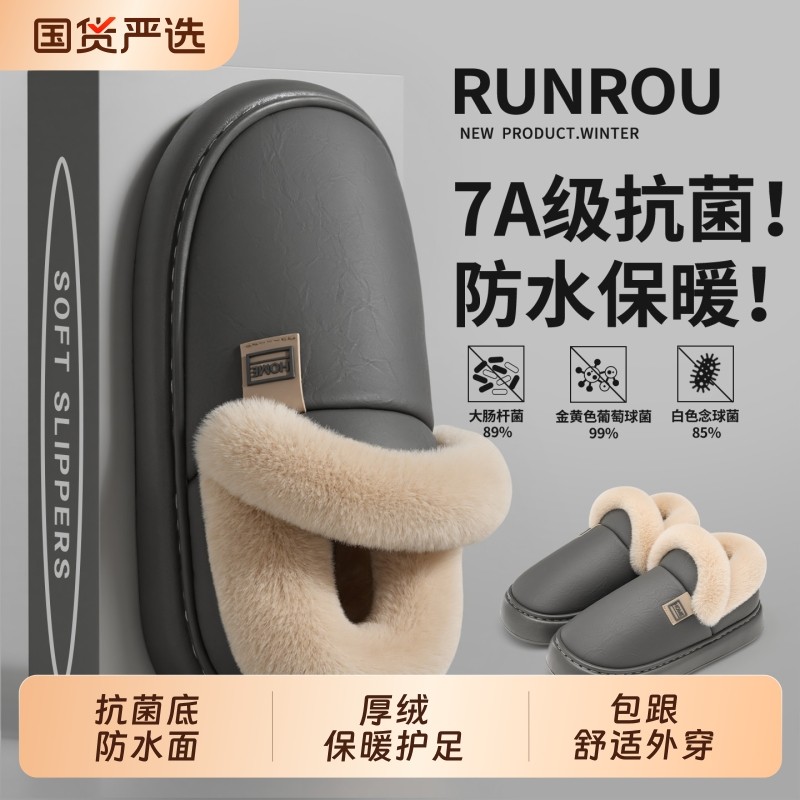 老人棉拖鞋女包跟冬季防水防滑厚底情侣加绒保暖带跟皮面男士棉鞋