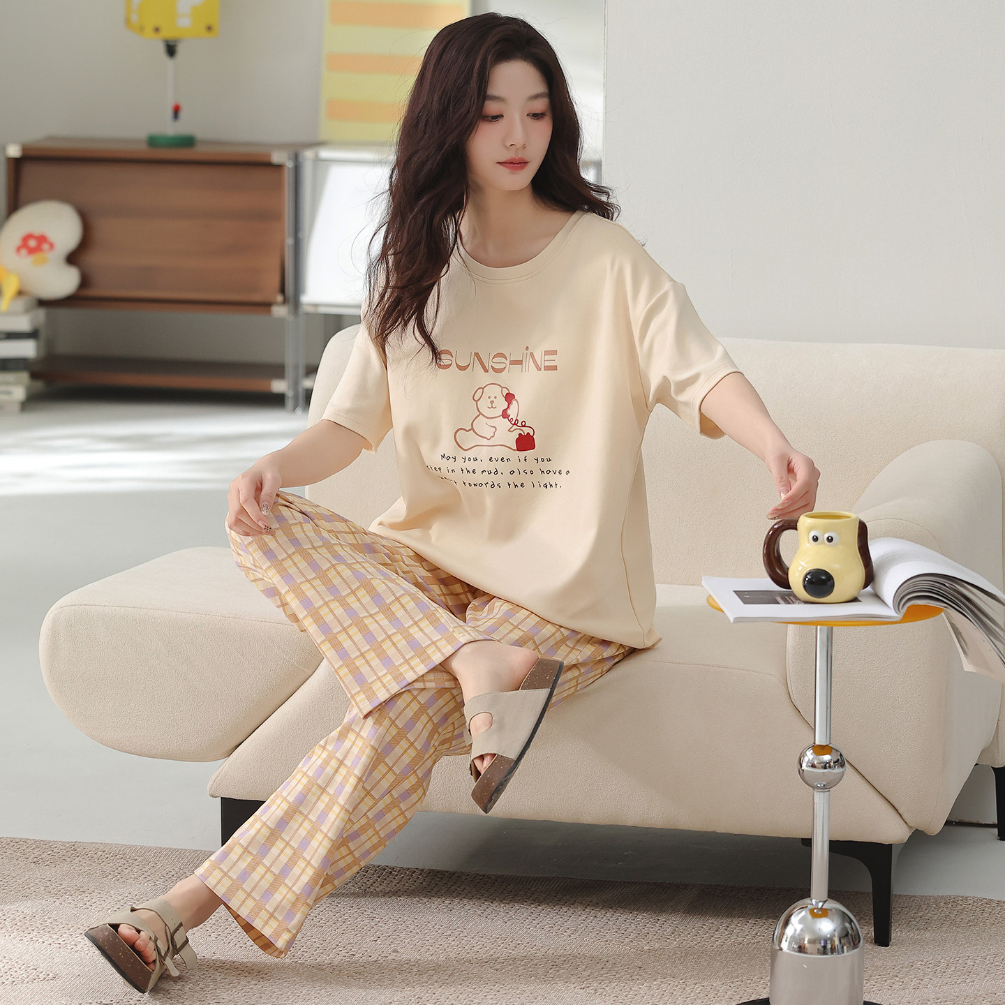 夏天纯棉短袖长裤睡衣女夏季带胸垫可外穿家居服中老年妈妈宽松款