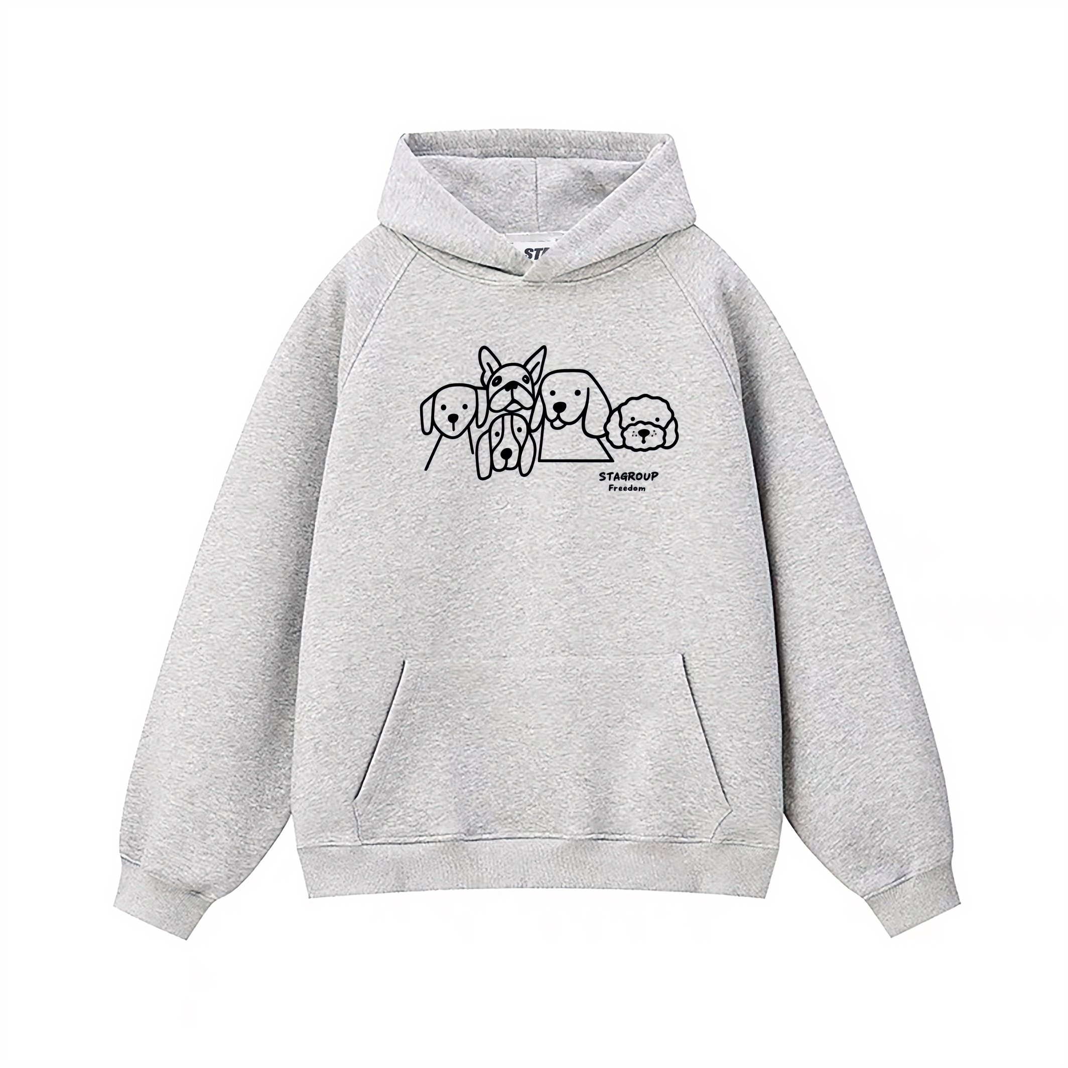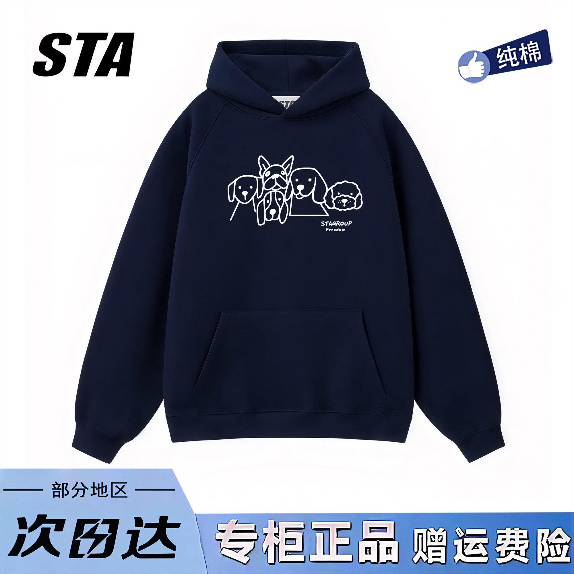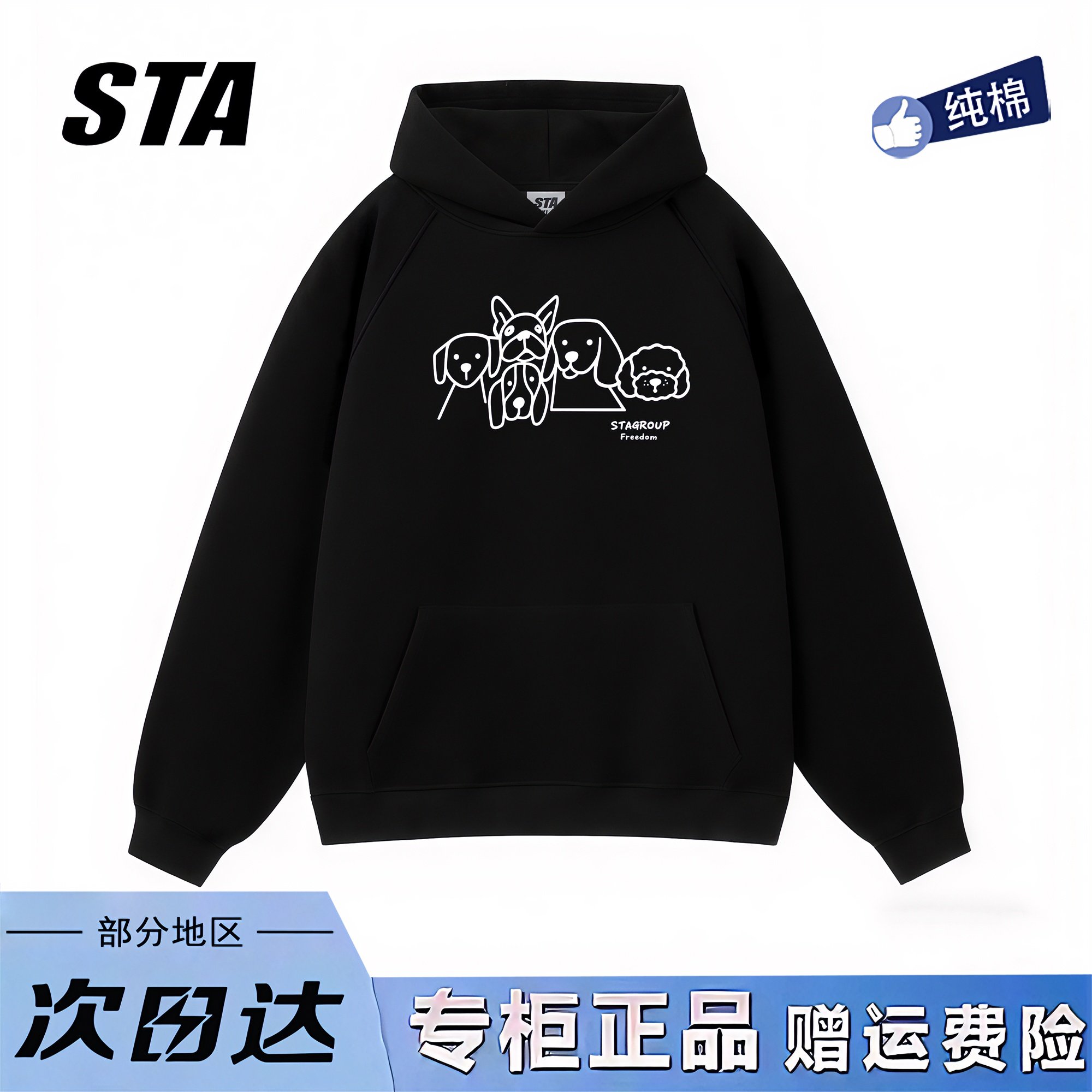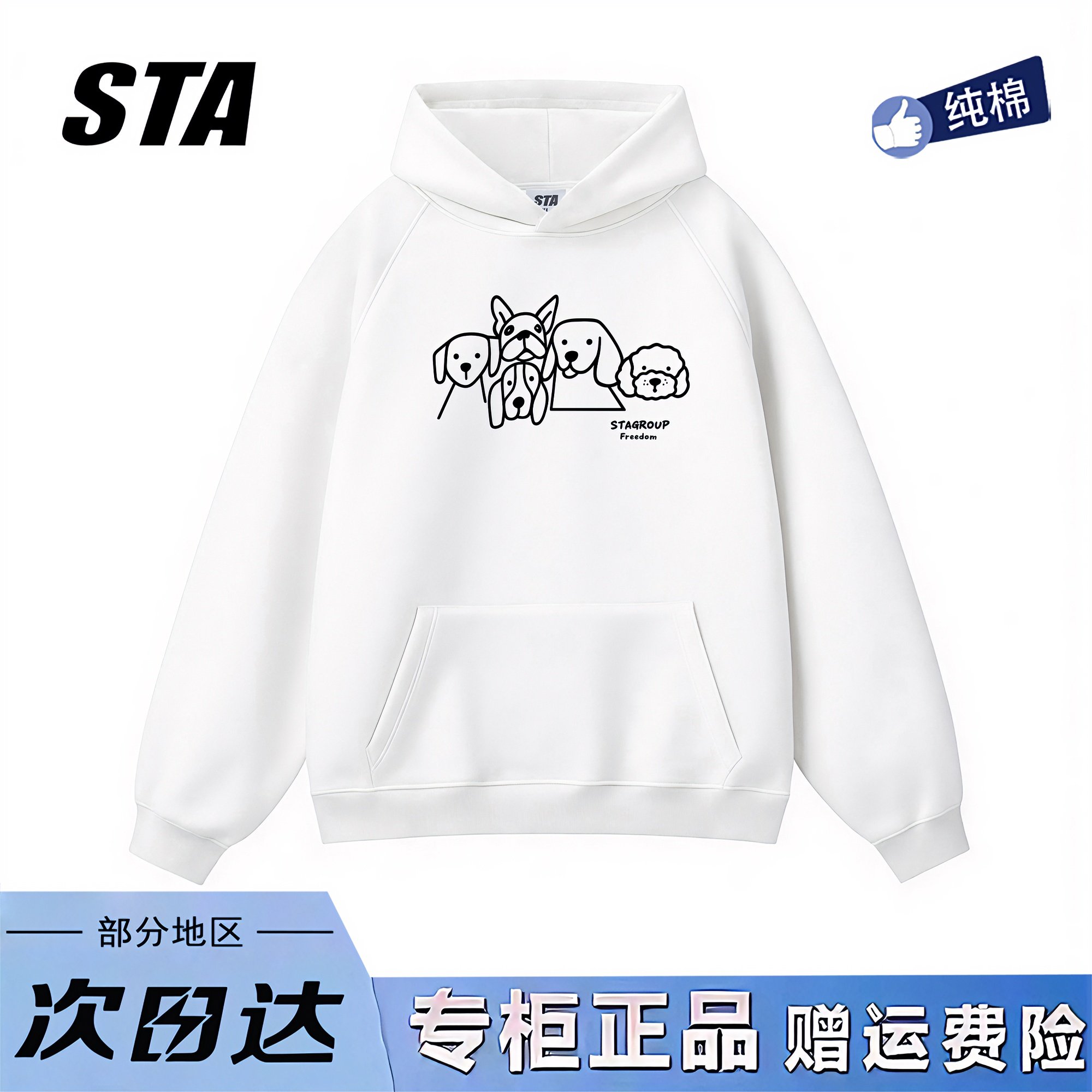 STA旗舰店美式趣味小狗印花连帽卫衣男女潮牌高街重磅灰色外套