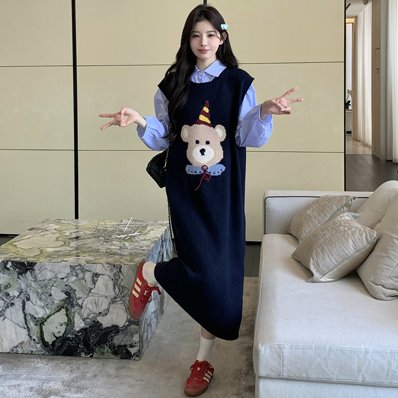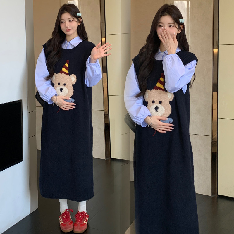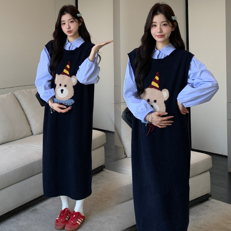 婧麒孕妇装连衣裙套装2025新款洋气休闲宽松小熊背带裙衬衫两件套