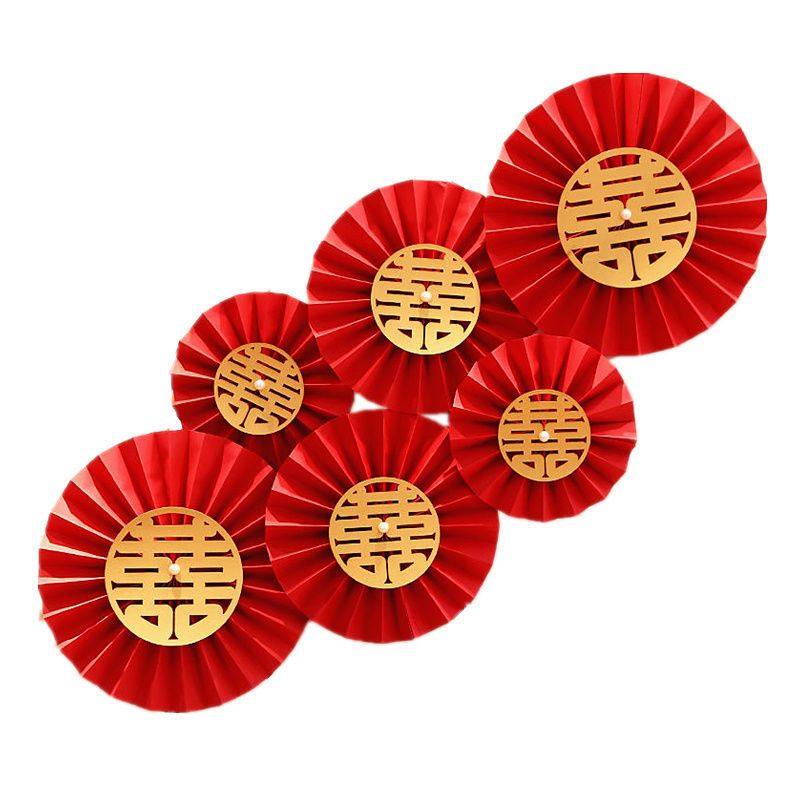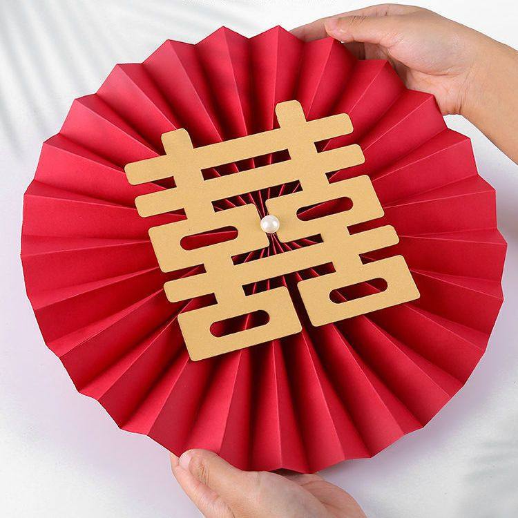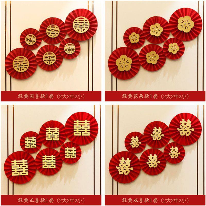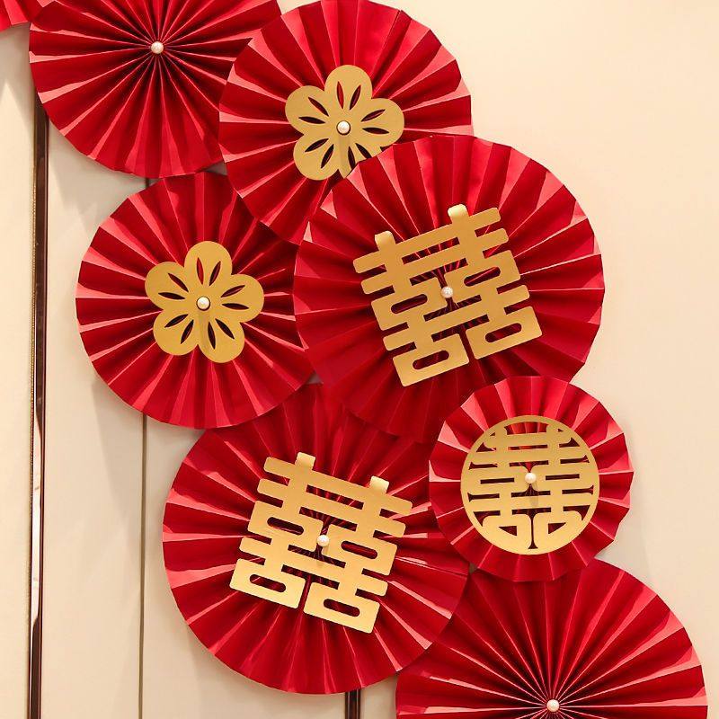 酒店婚房布置客厅结婚装饰女方卧室喜字纸扇花折扇纸简单红色新婚
