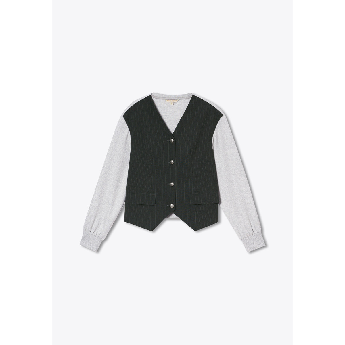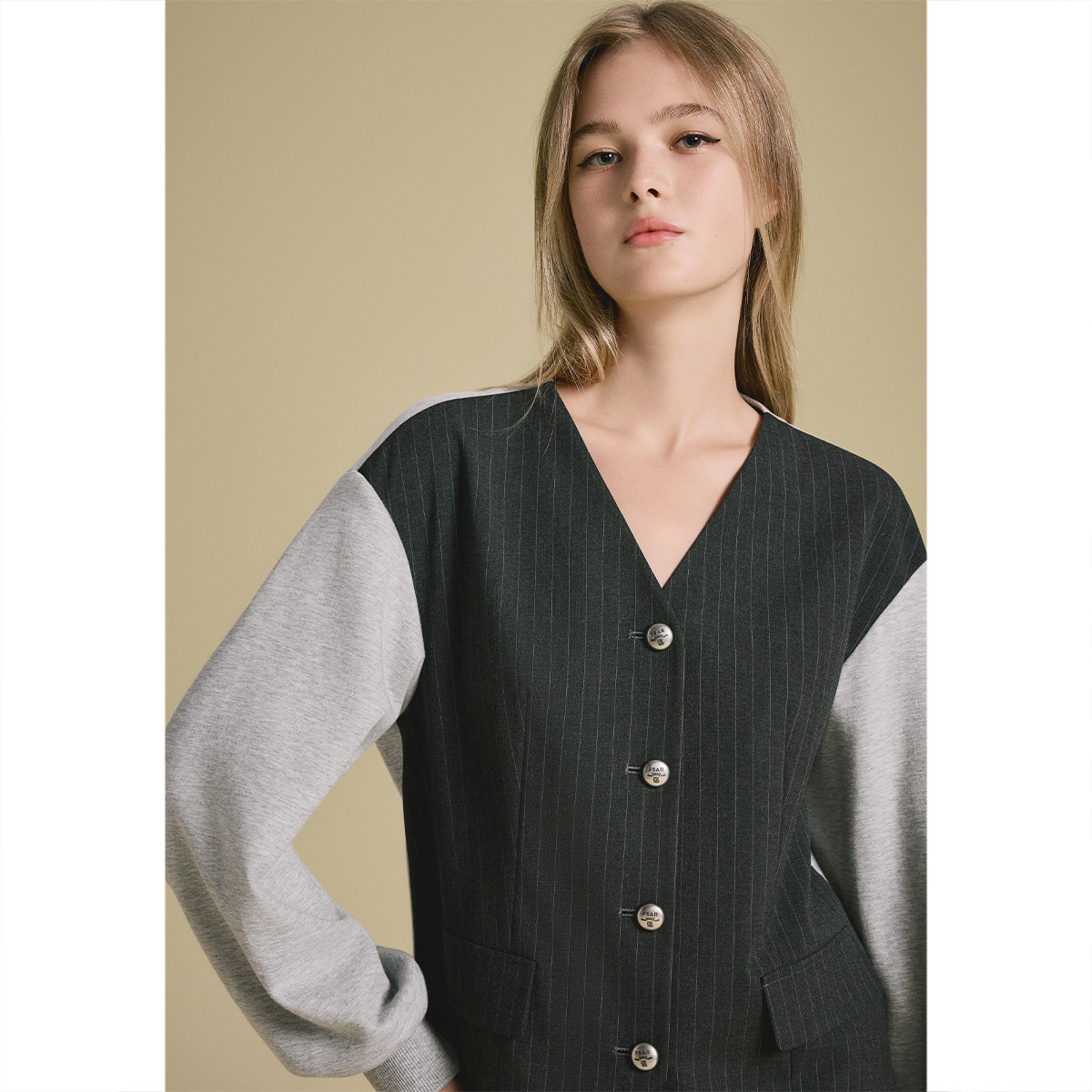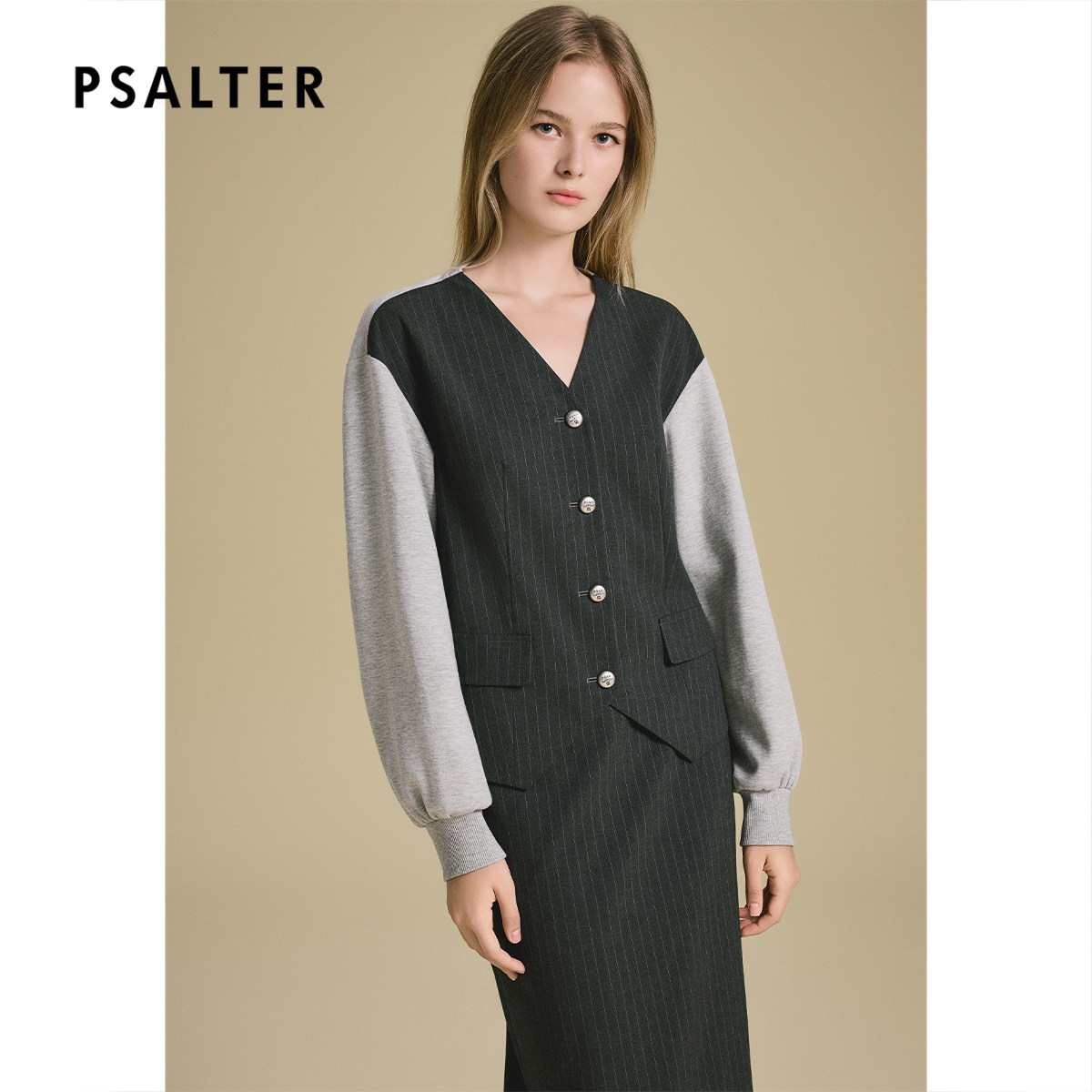 诗篇专选撞色假两件设计气质V领上衣外套2025秋款