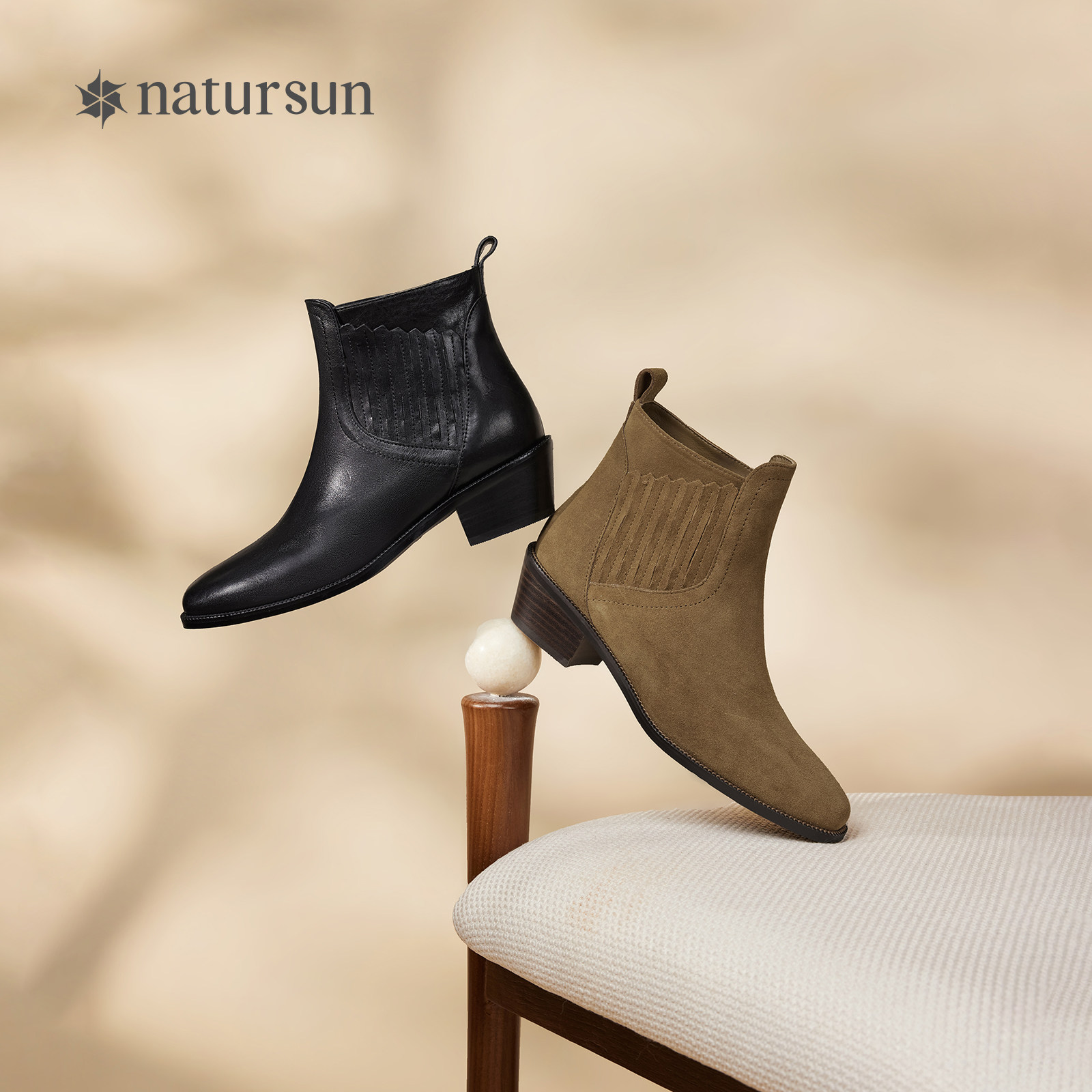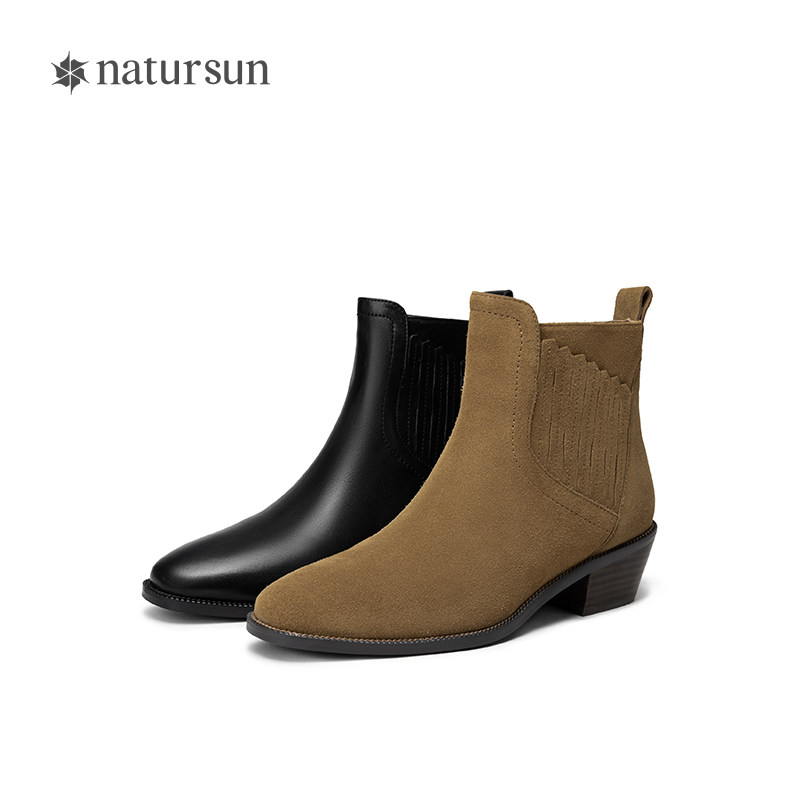natursun牛皮时装靴舒适冬冬季复古粗跟西部靴圆头舒适短筒春季