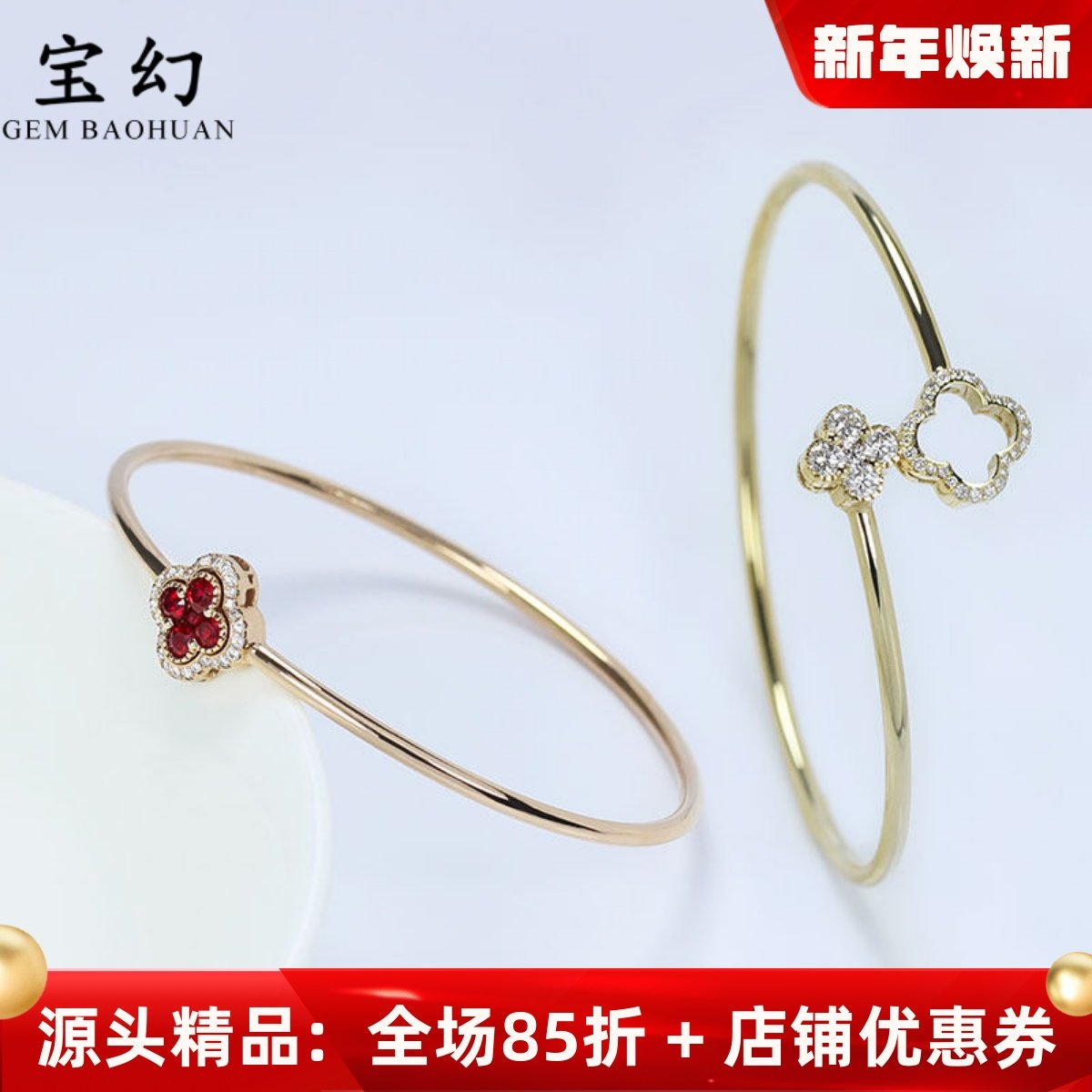 18K玫瑰金天然鸽血红宝石幸运四叶草弹力手镯 钻石弹性活口彩金女