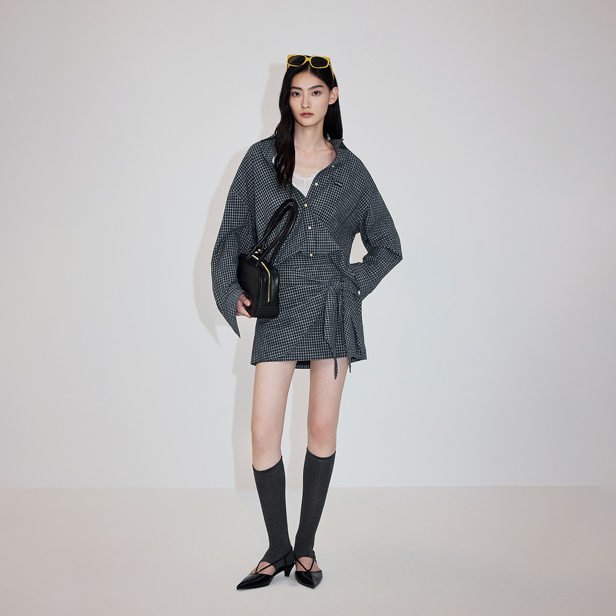 学院感格纹裙,拼接假两件