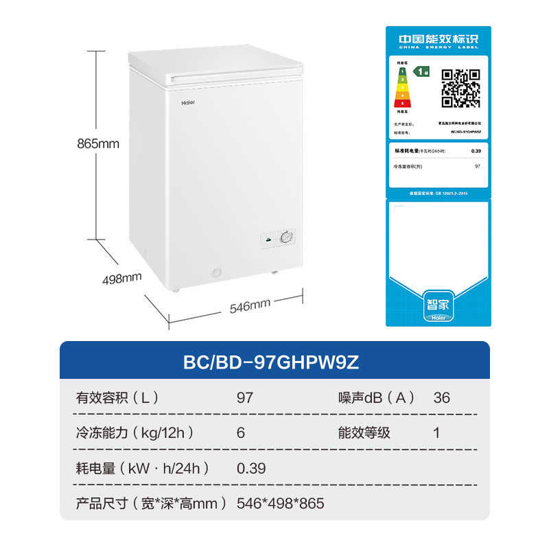海尔100L/200升冷柜家用小型保鲜冷冻冷藏冷冻一级能效白色冰柜