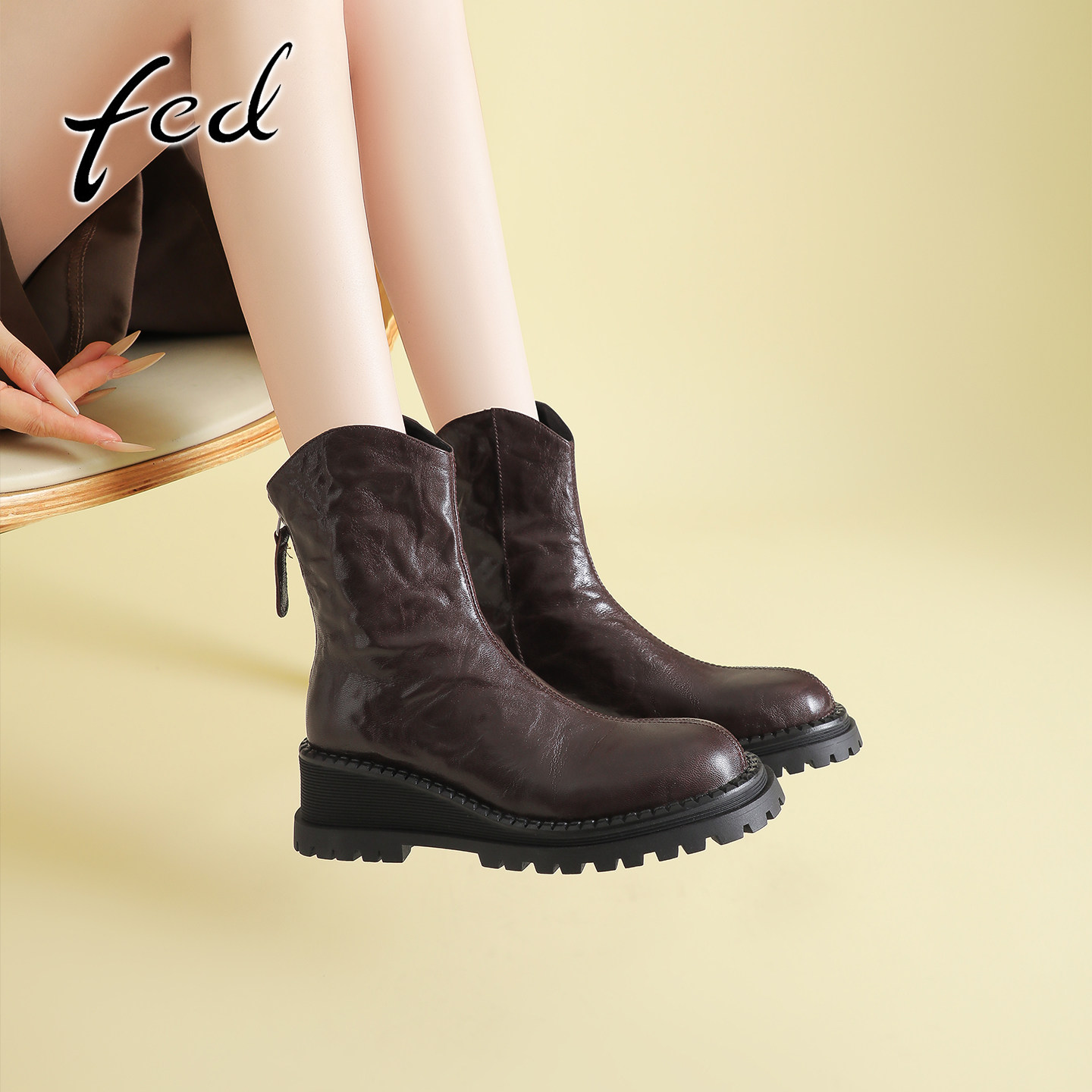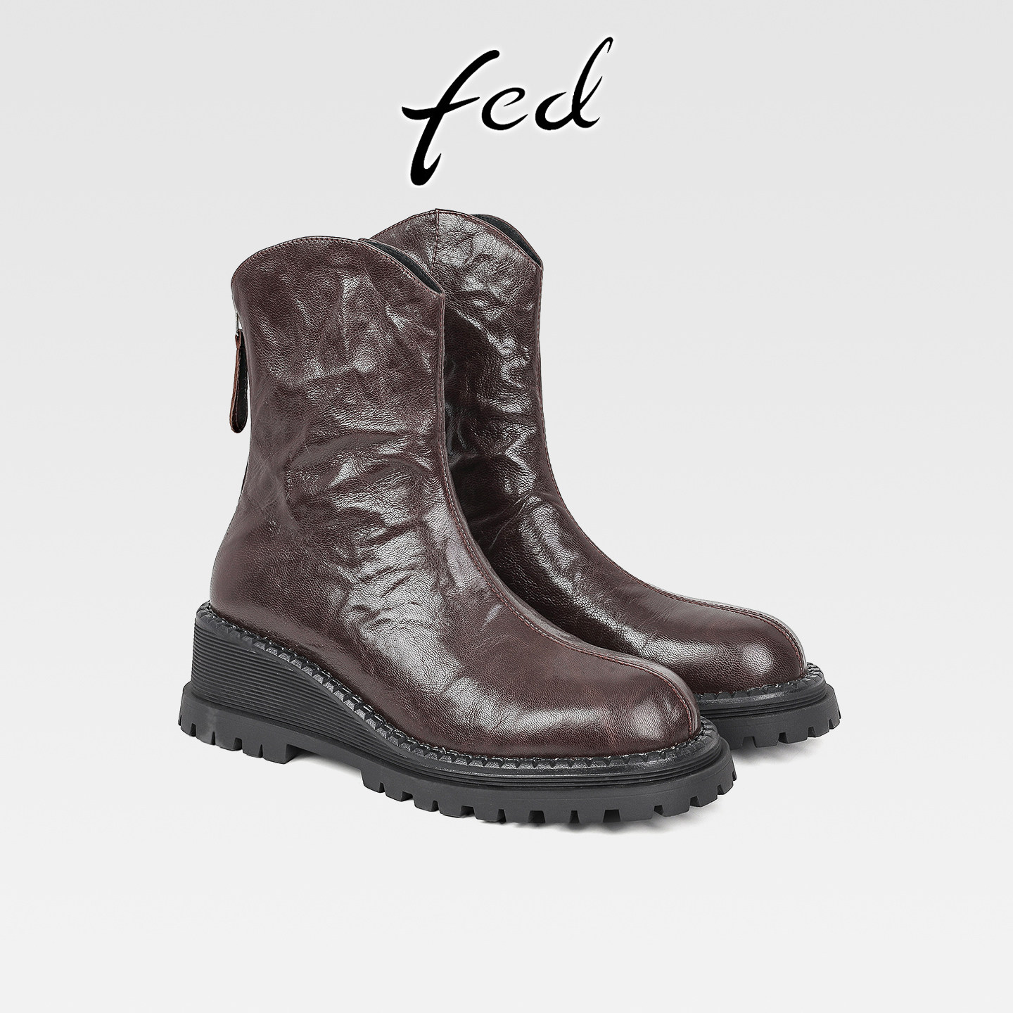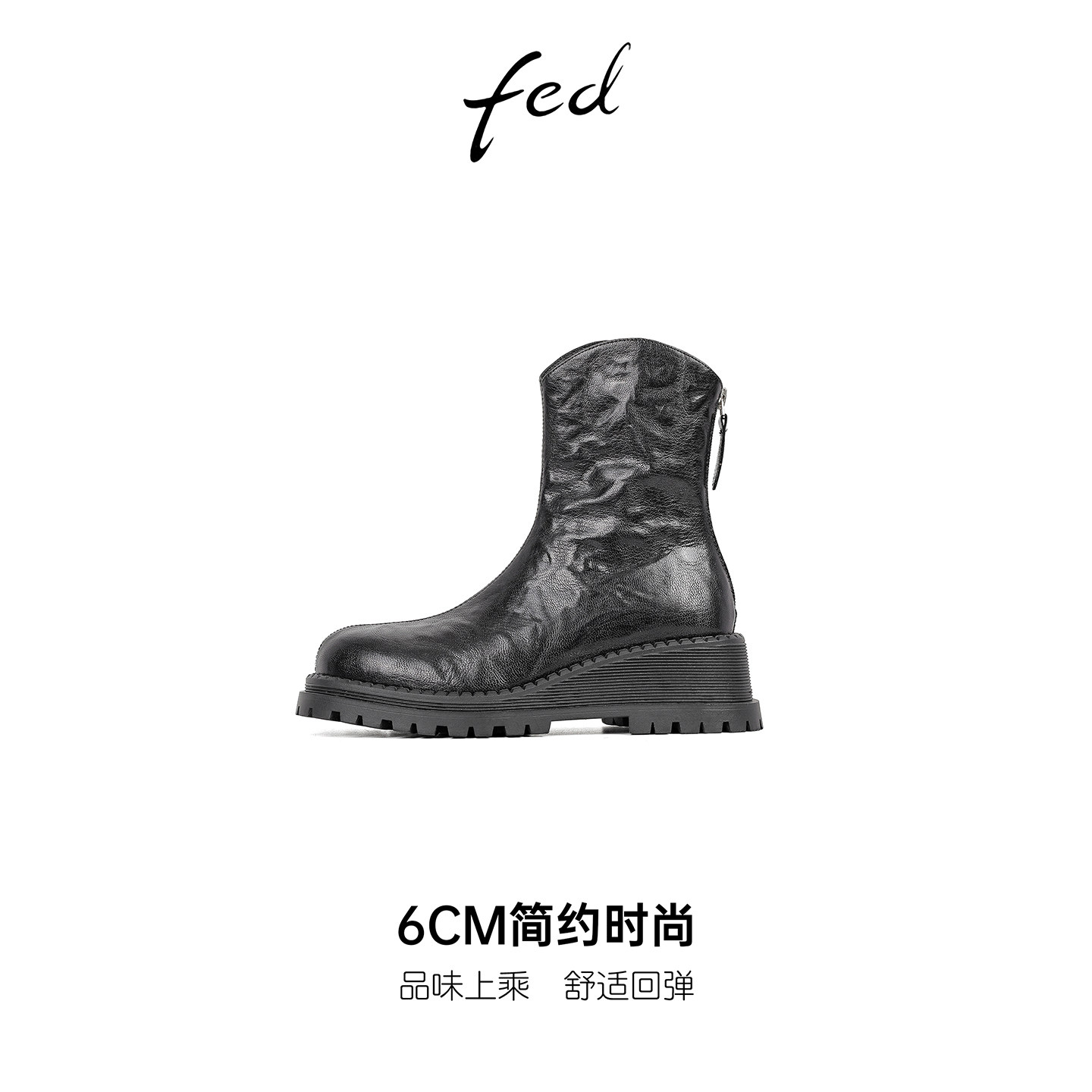 fed英伦风复古羊皮厚底马丁靴女秋冬新款后拉链圆头坡跟显瘦短靴