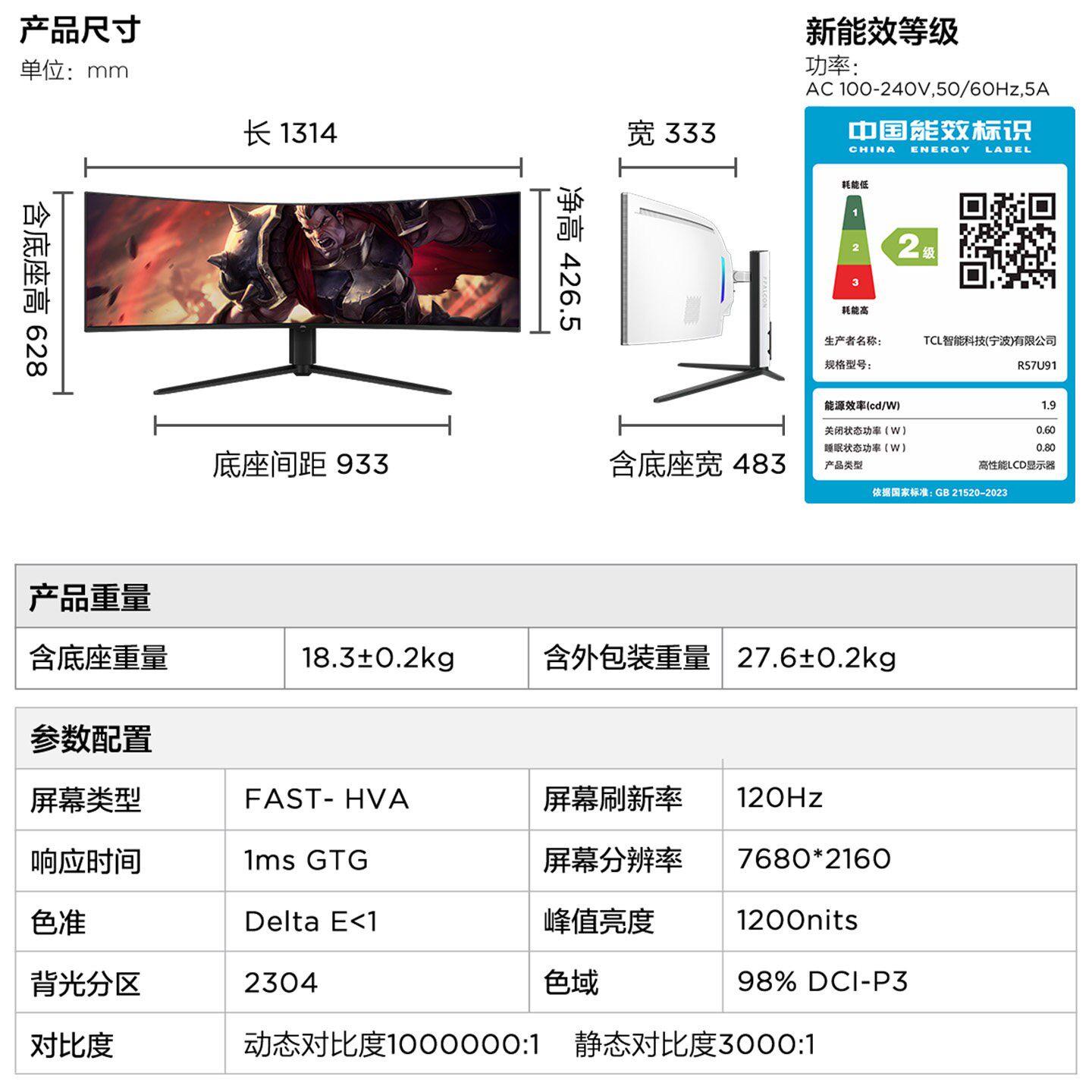 TCL雷鸟U9 57英寸8K32:9曲面屏120Hz 9216灯珠QD-MiniLED显示器