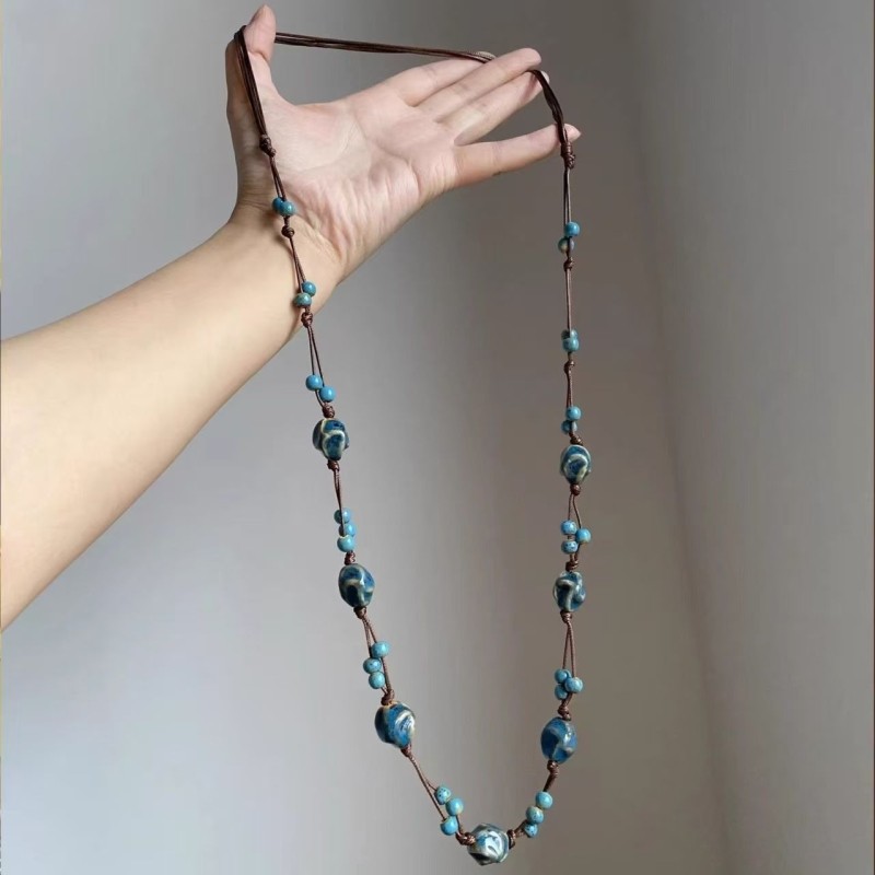 民族风小众蓝色编织串珠项链女编织吊坠长款毛衣链高级颈链配饰