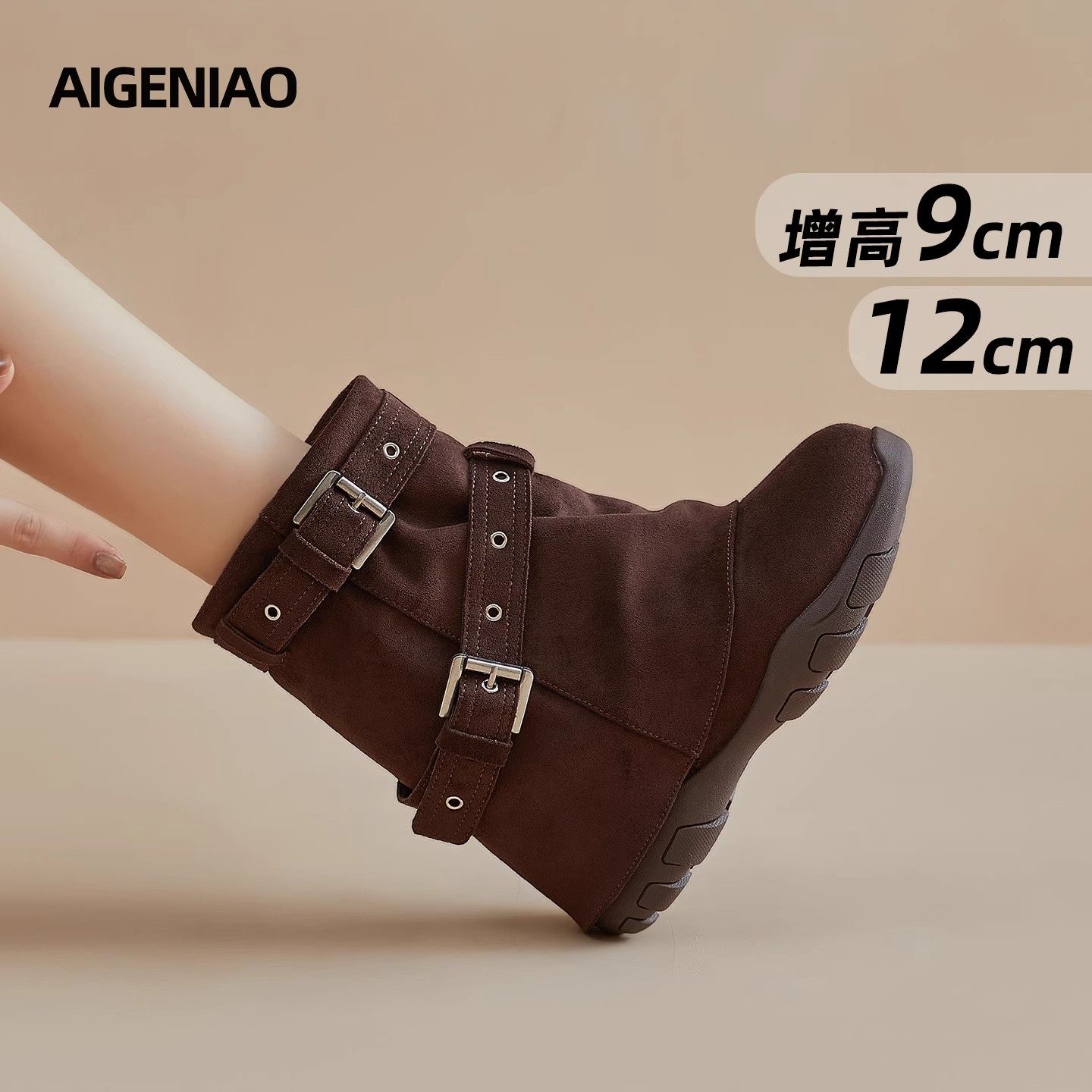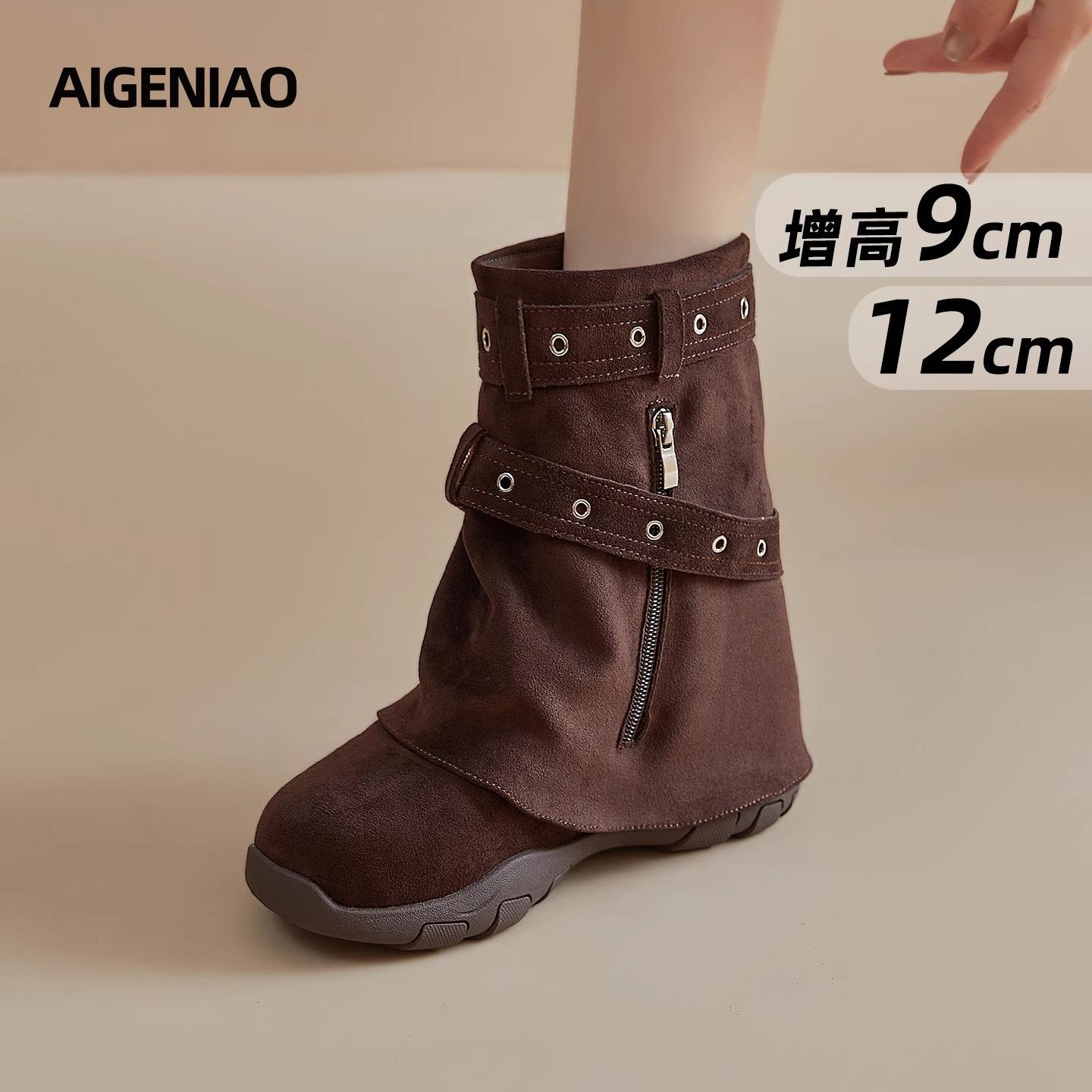 棕色靴子!小个子内增高7CM法式方头靴2025冬新款绒面粗跟短靴女