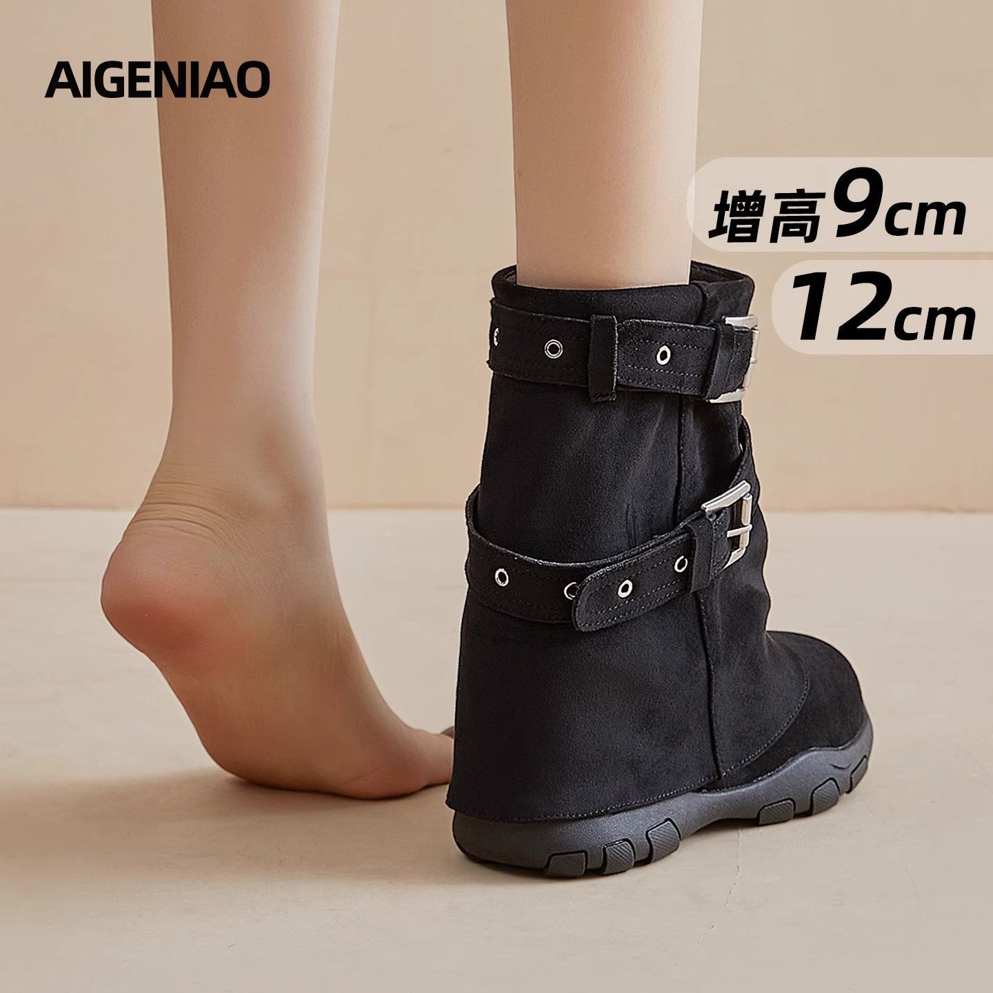 马丁靴女2025冬季新款小个子12裤管靴隐形内增高女靴子高跟黑色