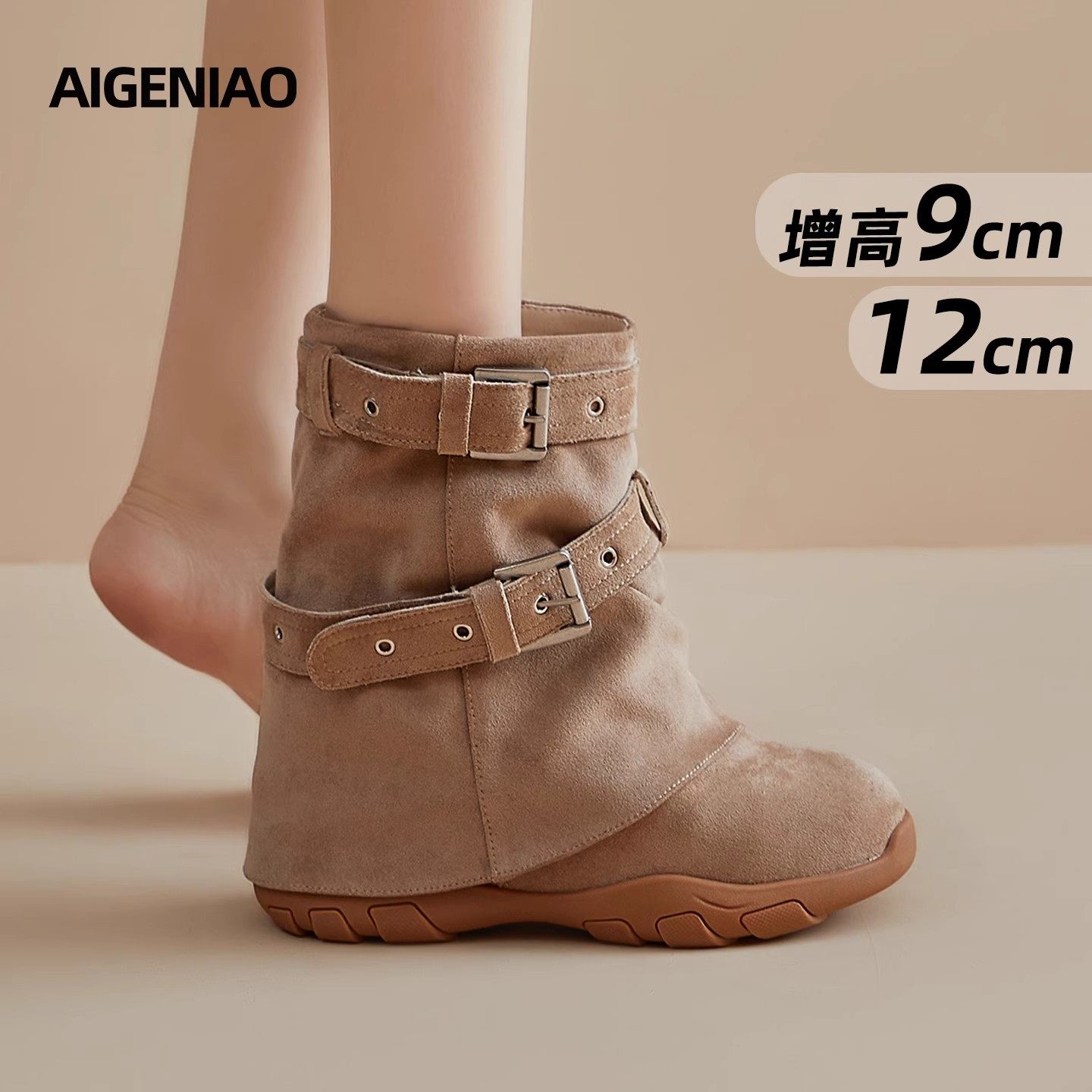羊皮版~内增高靴子女2025新款爆款中筒粗跟短靴卡其色褶皱堆堆靴