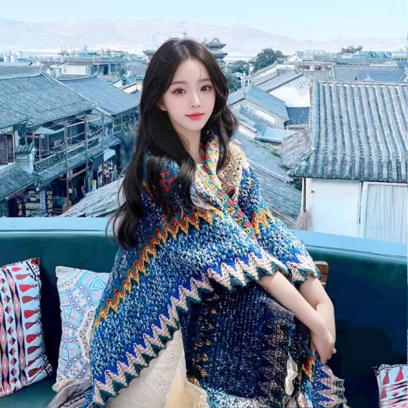 云南丽江民族风蓝色旅游披肩女外搭氛围感时尚披风斗篷针织围巾女