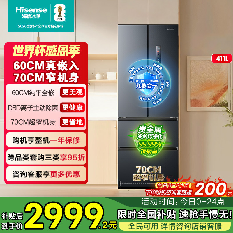 海信411小户型零嵌入式法式多门冰箱60cm超薄零嵌换新补贴