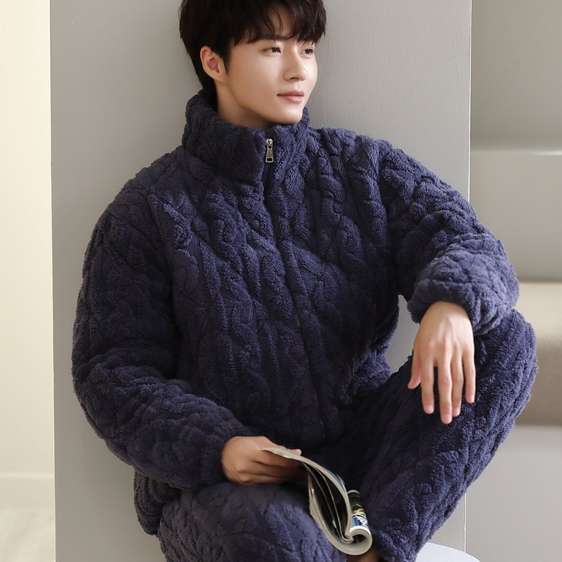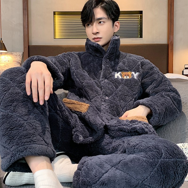 冬季珊瑚绒男士睡衣三层夹棉加厚加绒法兰绒秋冬款家居服保暖套装