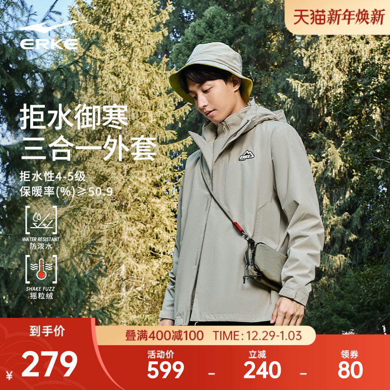 鸿星尔克外套男冬季男士小山标三合一加绒冲锋防泼水夹克上衣风衣
