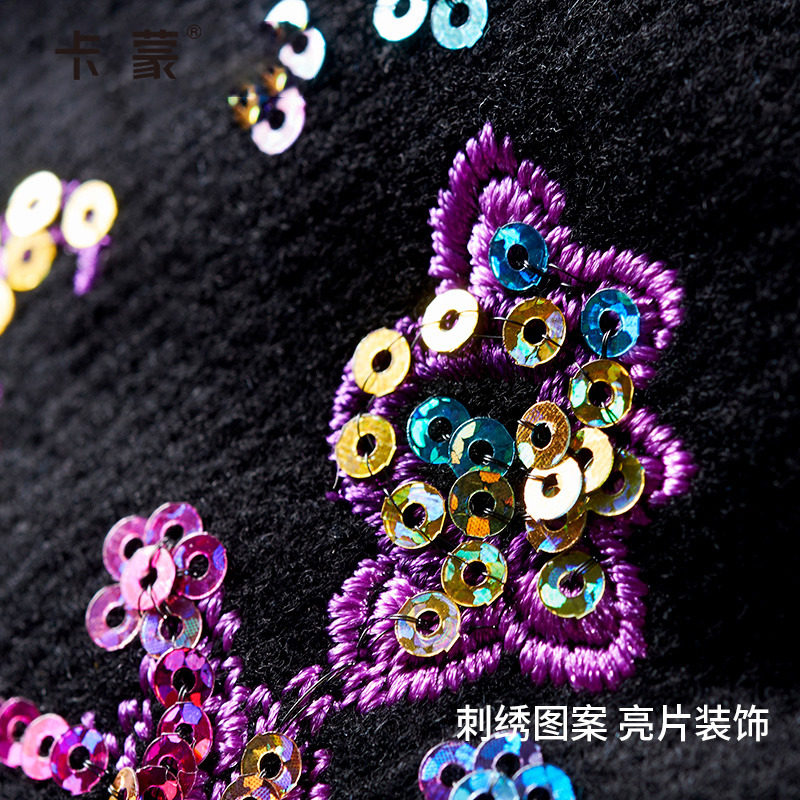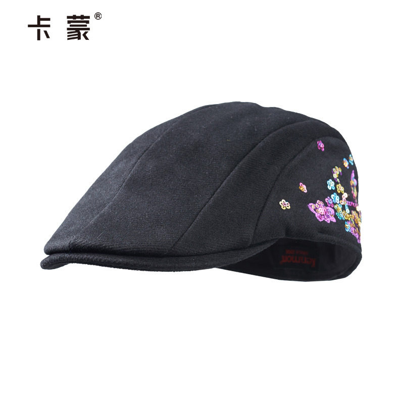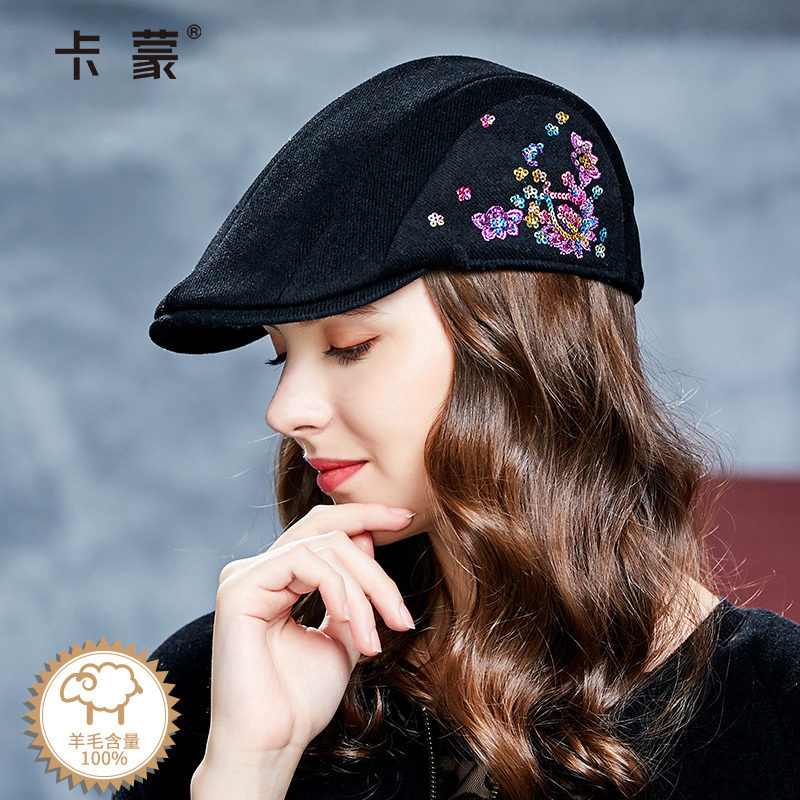 卡蒙全羊毛秋季复古毛呢贝雷帽女英伦立体黑帽子刺绣亮片鸭舌帽冬