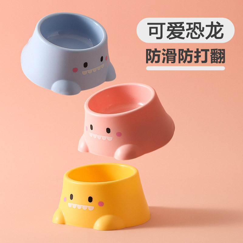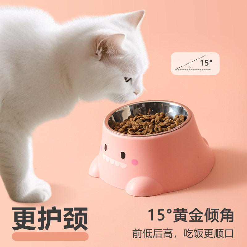 新款狗碗小恐龙造型单碗喂食斜口护颈不锈钢宠物猫咪食具猫碗吃饭