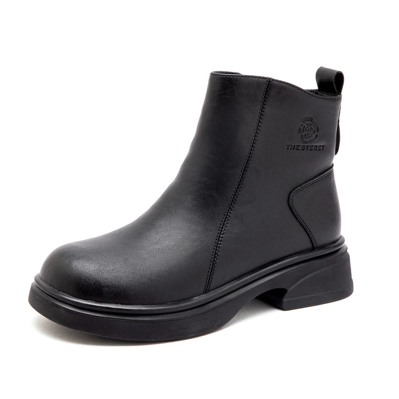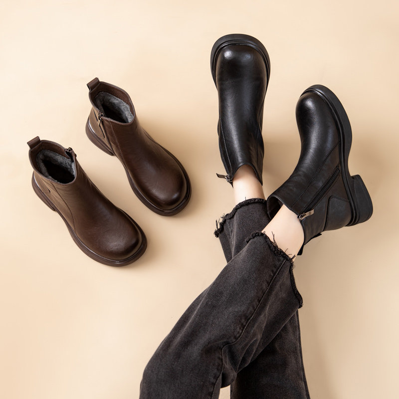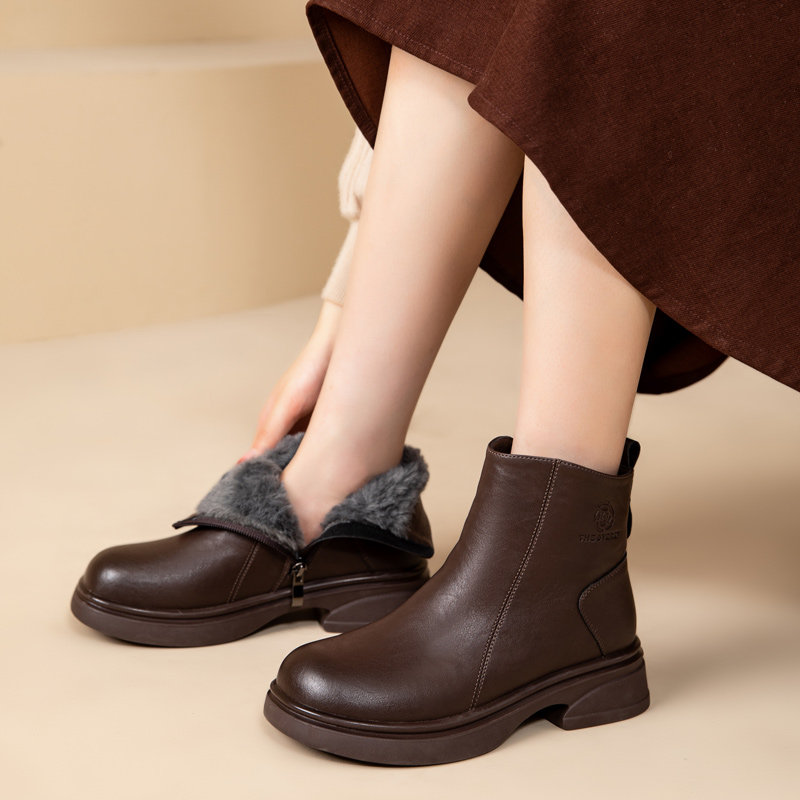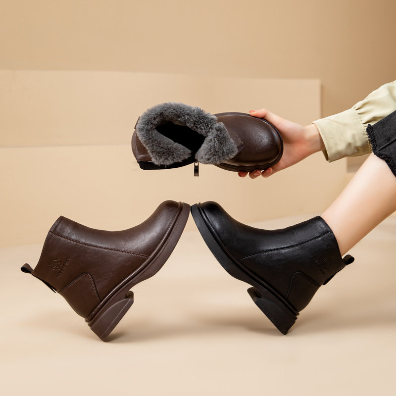 他她女孩真皮软底短靴妈妈鞋子棉鞋加绒中老年皮鞋女鞋子2025黑色
