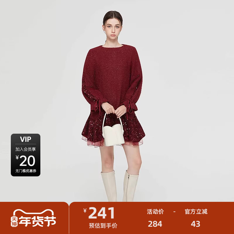 【新年款】sdeer圣迪奥女装复古系带网纱亮片毛呢外套S234Z2261