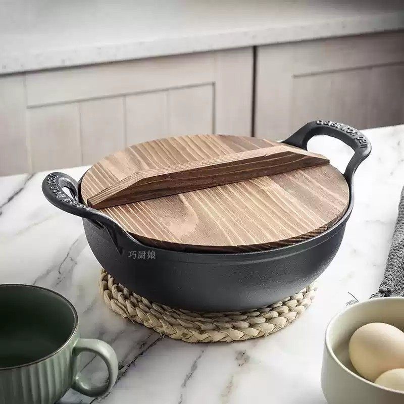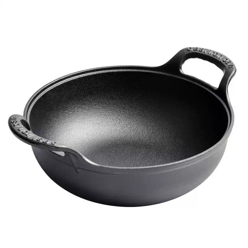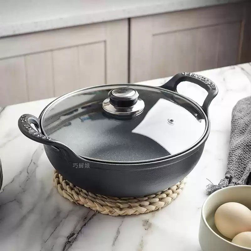 铸铁元宝锅小钢炮双耳炖锅炒锅不粘锅电磁炉燃气通用无涂层平底锅