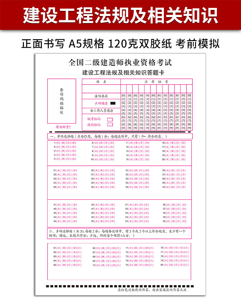 新版二级建造师答题卡二建考试工程管理与实务法规及相关知识 A5规格 正面书写 120克双胶纸