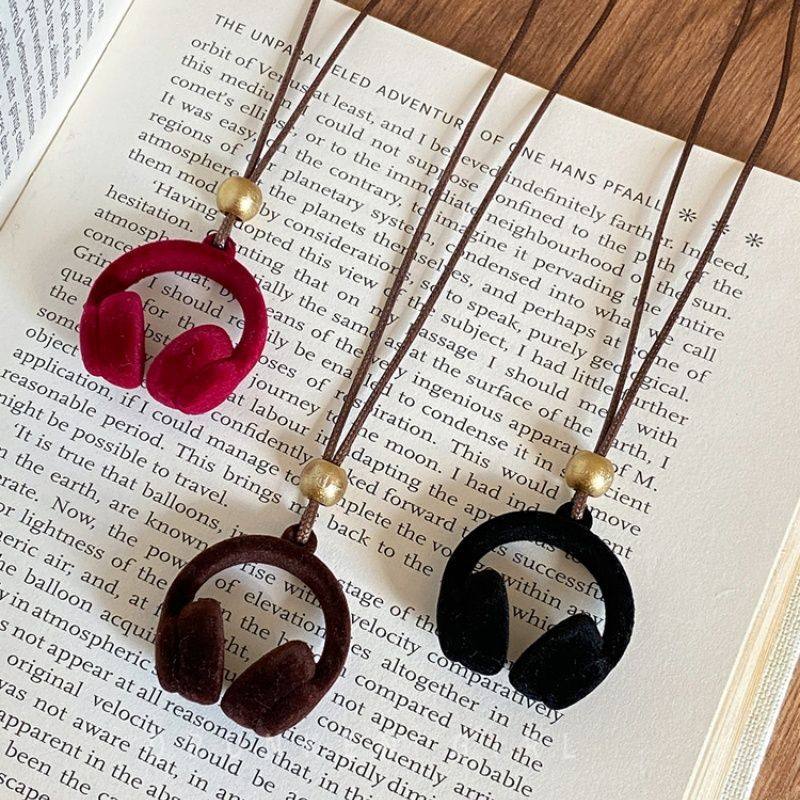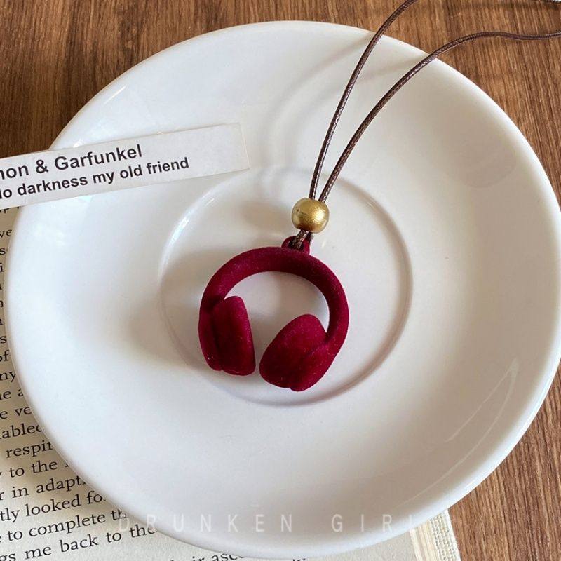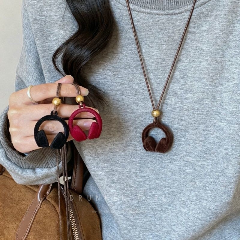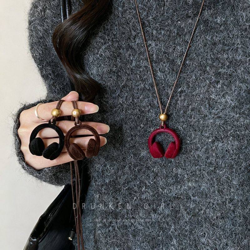 嘻哈风 红色植绒耳机吊坠项链女秋冬复古2025新款长款毛衣链配饰