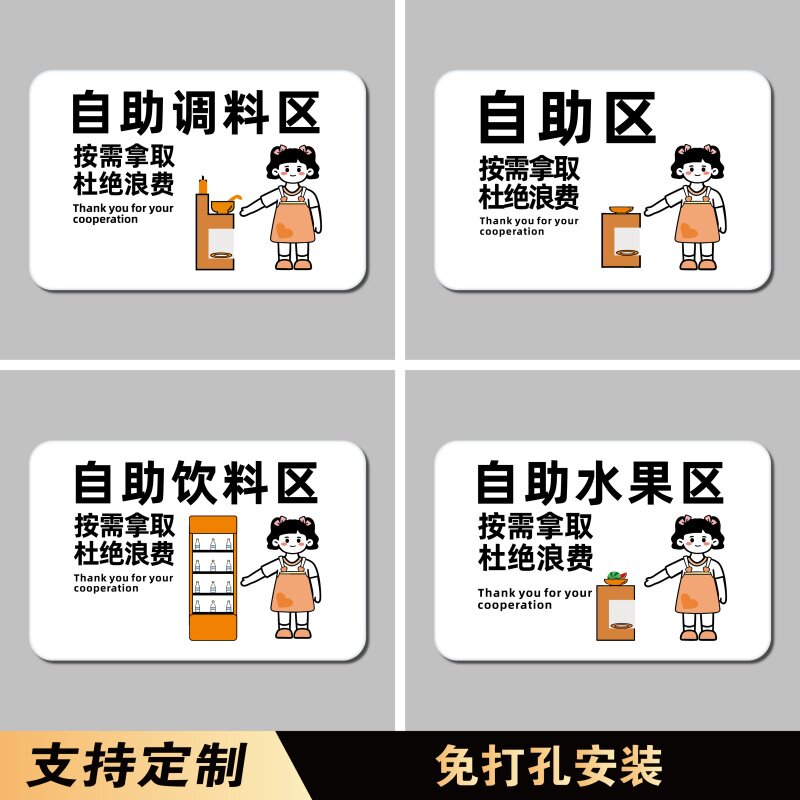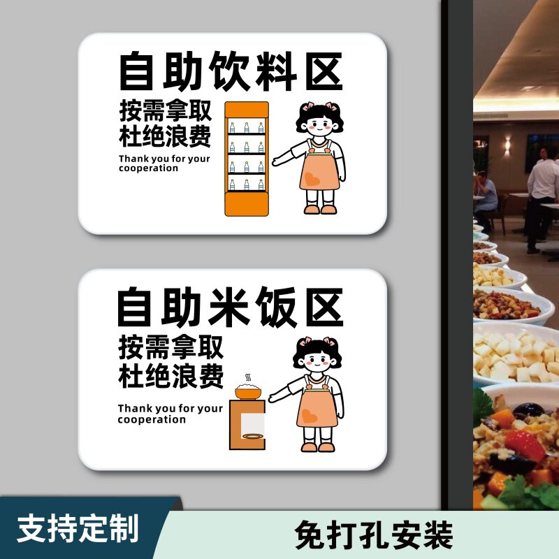 酒店火锅店自助餐厅饭店自助区提示牌自助饮料调料米饭水果区勤拿少取杜绝浪费温馨提示牌亚克力创意标识牌贴