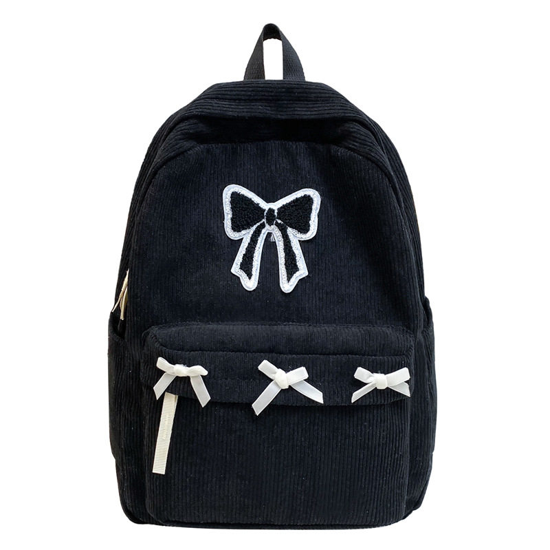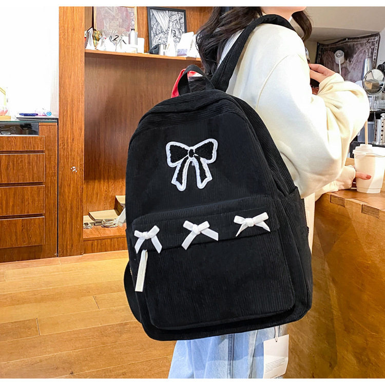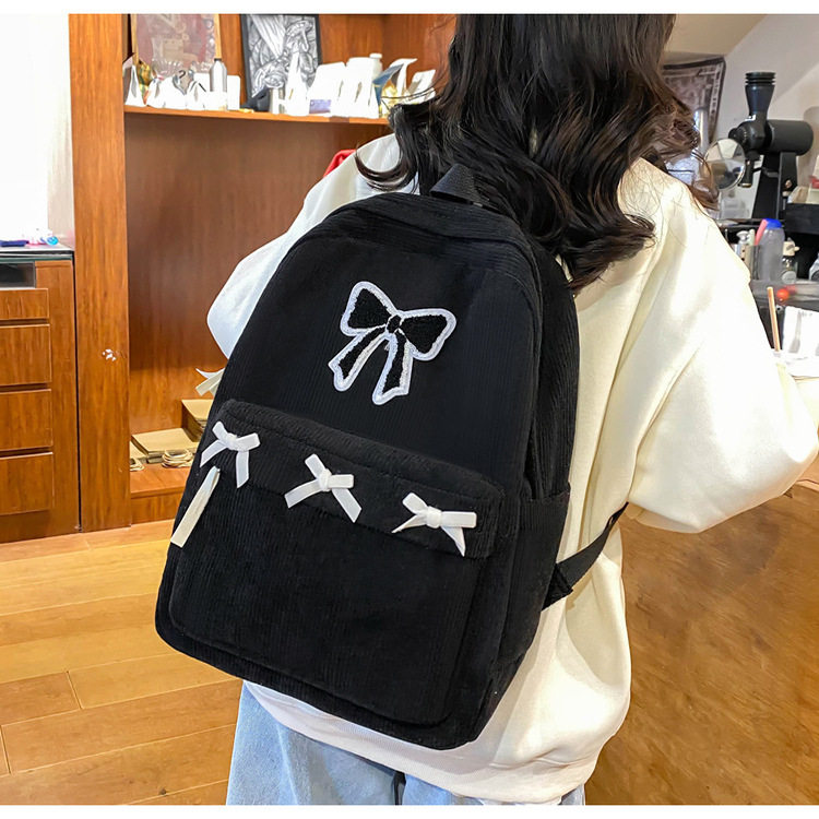 稻草人新款书包初中女生高颜值蝴蝶结双肩包条绒慵懒风大学生背包