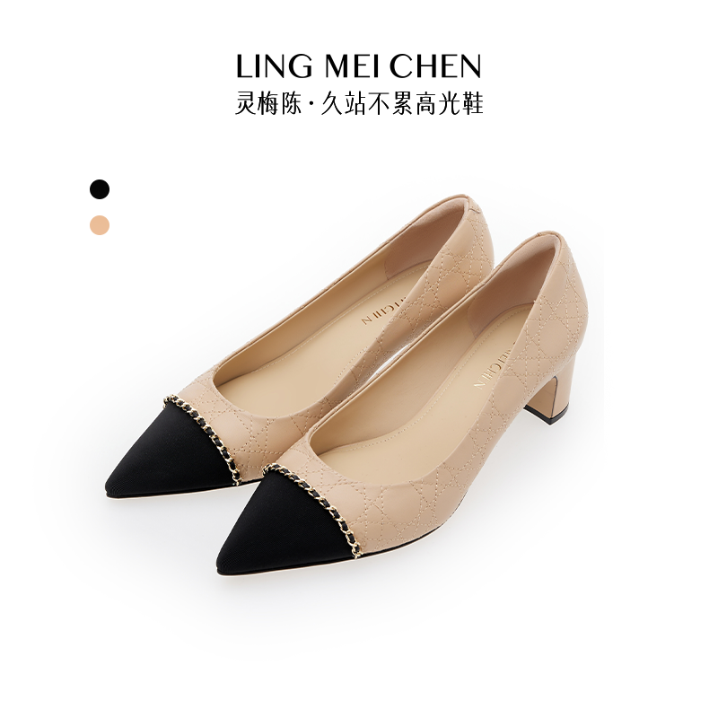 LINGMEICHEN小香风单鞋尖头拼色高跟鞋新款粗跟气质裸色中跟女鞋