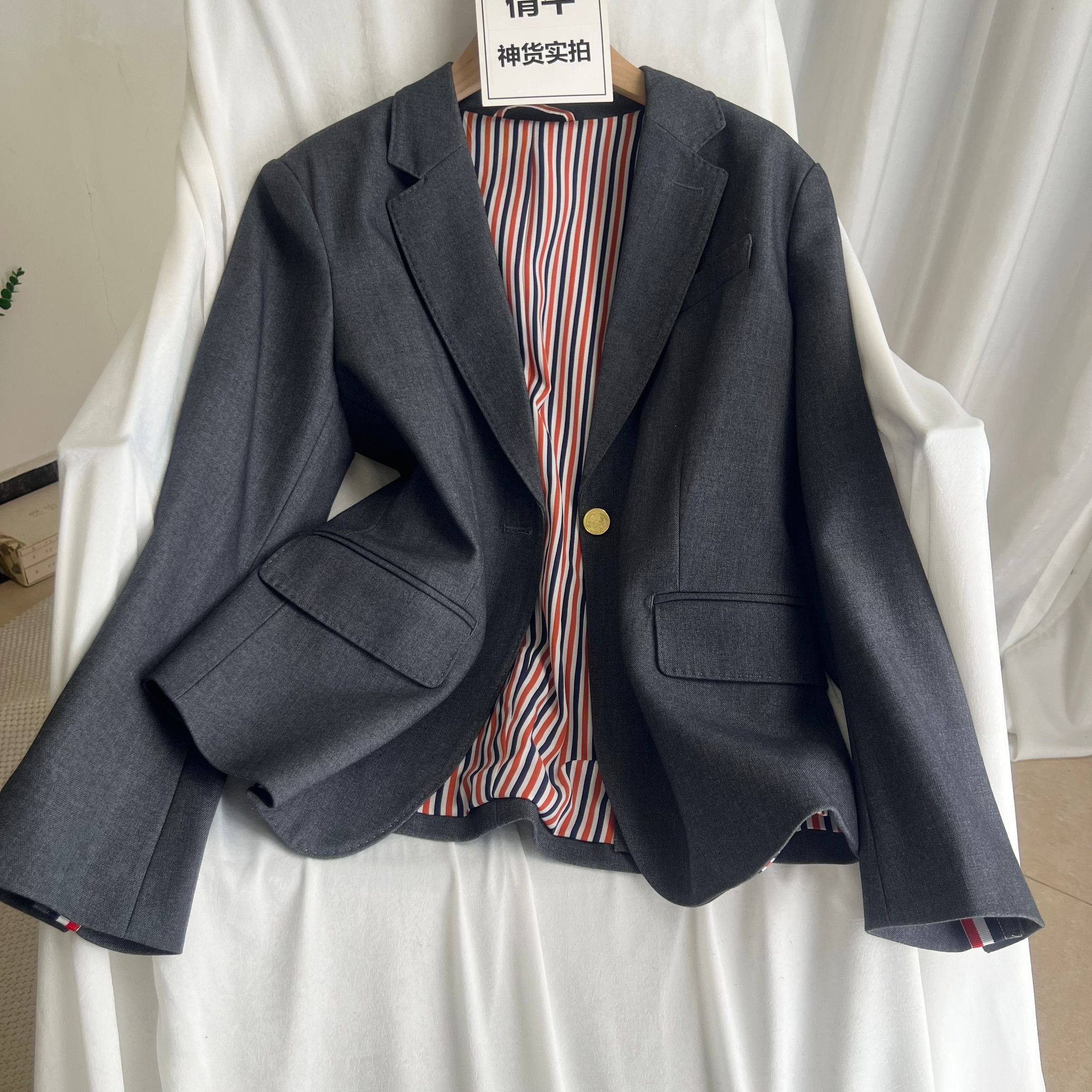 灰色自制小西服女oversize小众设计感宽松学院风卡其大码西装外套