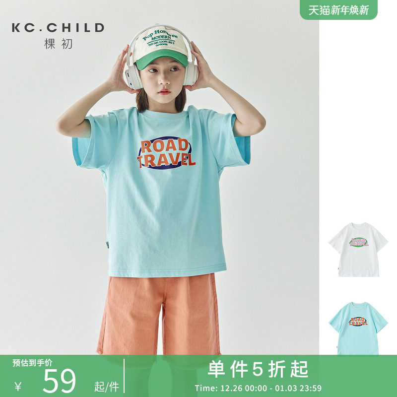 棵初2025夏季新品亲子两色休闲短袖T恤儿童字母印花全棉圆领上衣