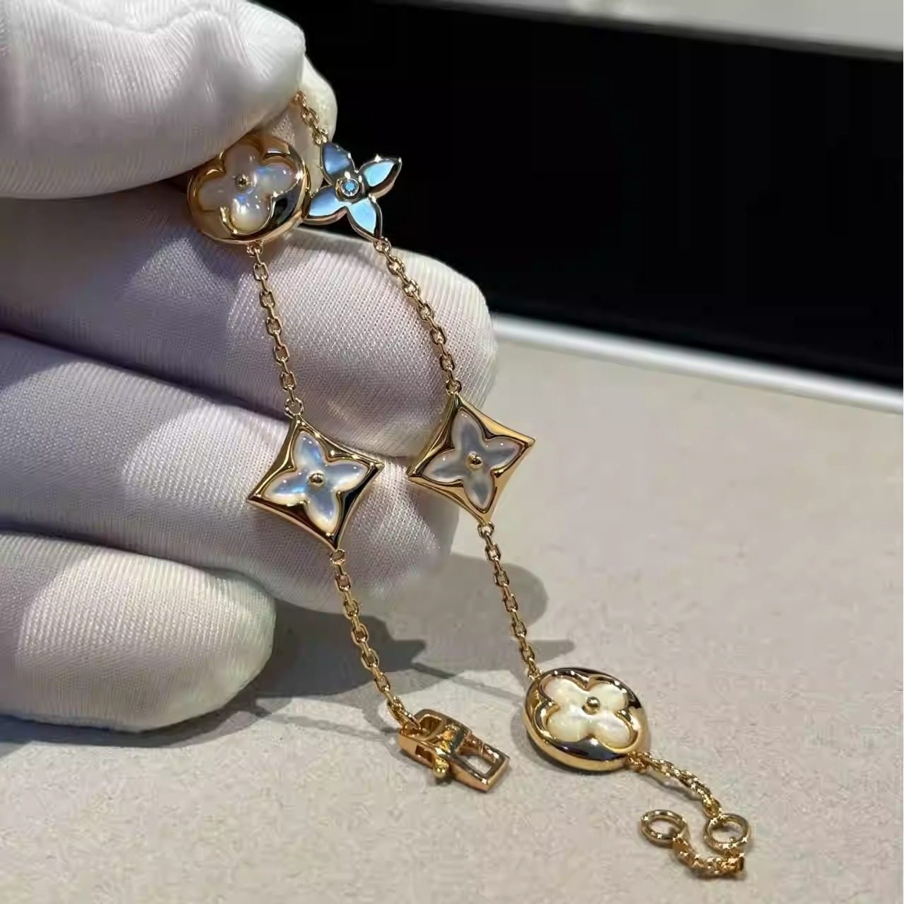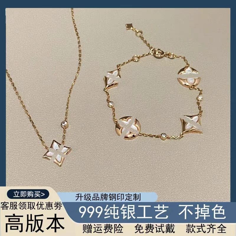 高版本菱形四叶草项链玫瑰金四花贝母手链中古银饰戒指饰品套装