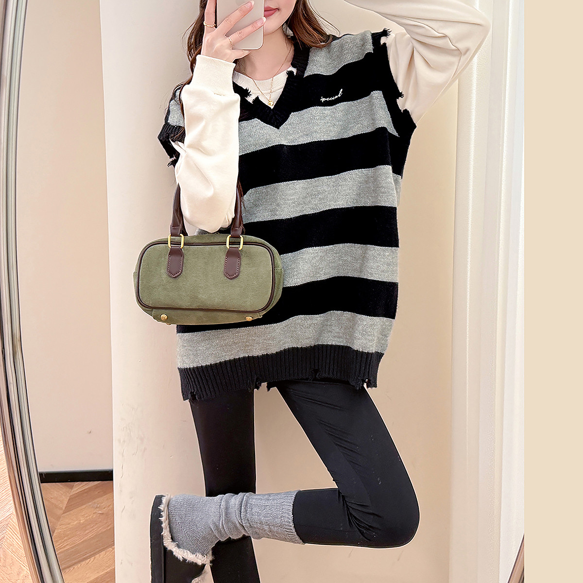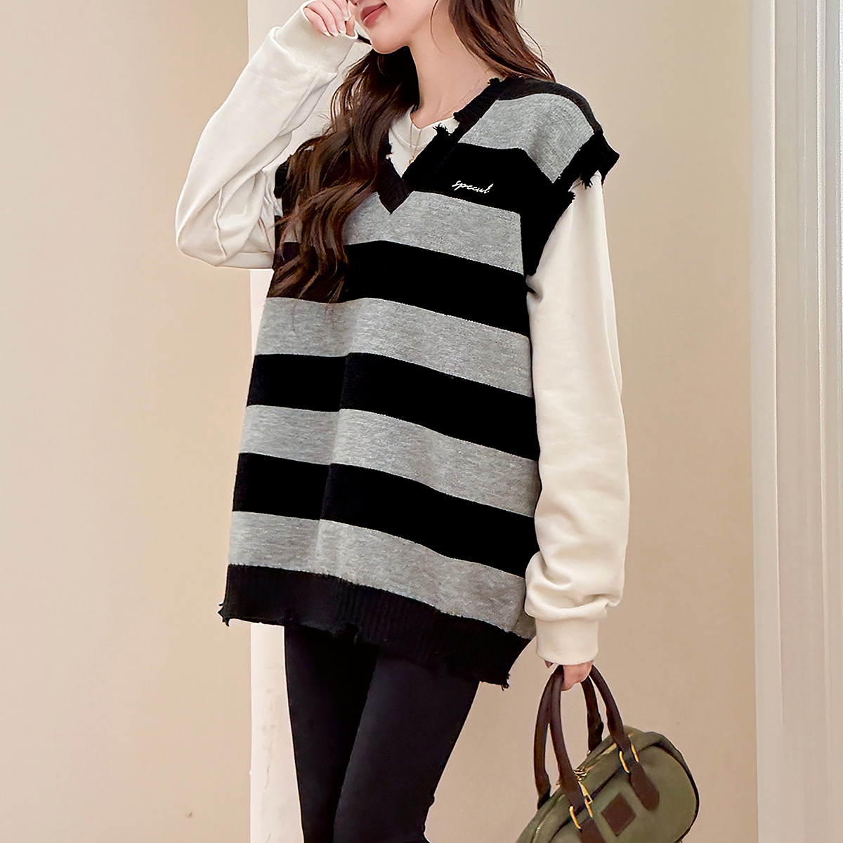 唐狮秋冬毛衣女宽条纹设计V领宽松套头马甲外穿高级感百搭潮TM