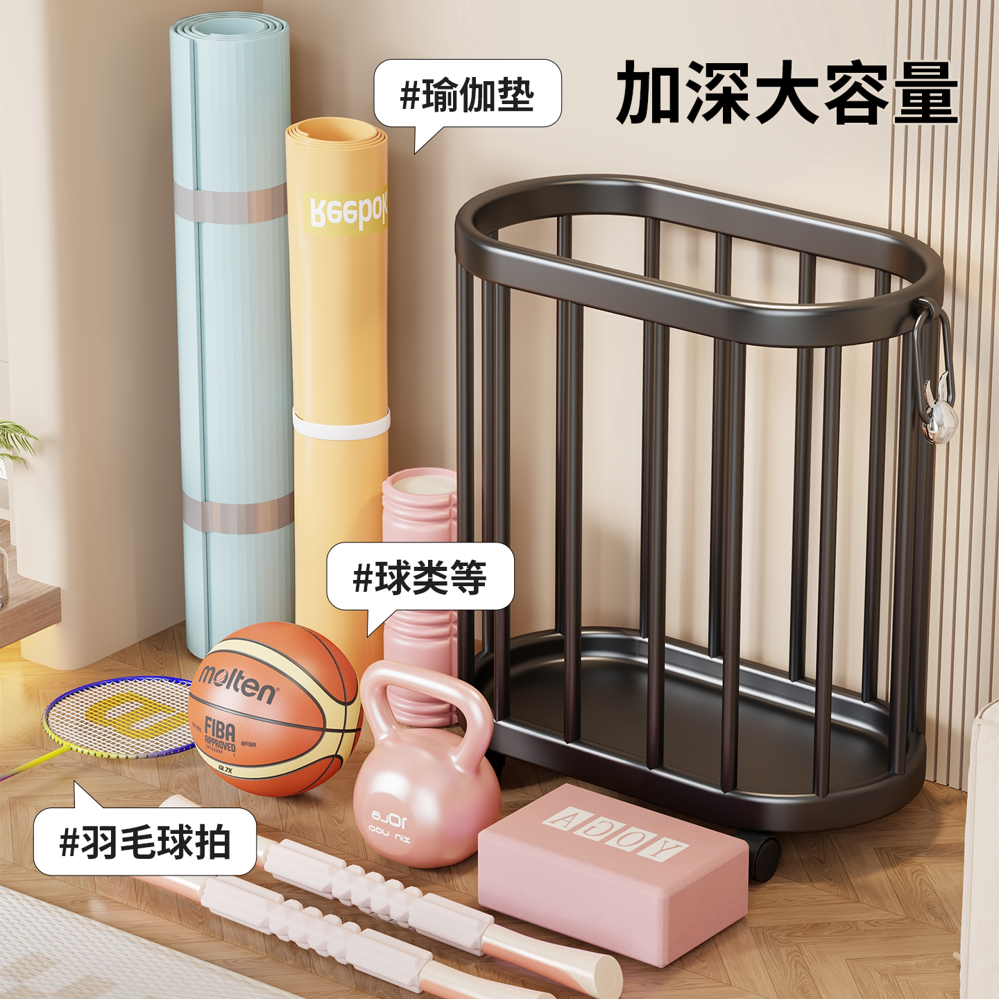 瑜伽垫收纳筐带轮运动健身器材拉伸工具置物架神器羽毛球拍收纳架