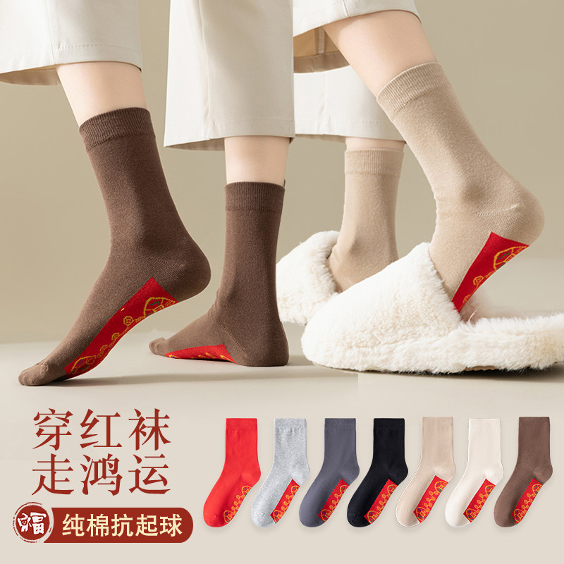 猫人本命年脚踏七星红袜子男女秋冬季纯棉中筒袜2025属蛇年情侣袜